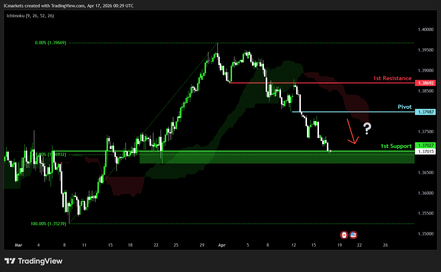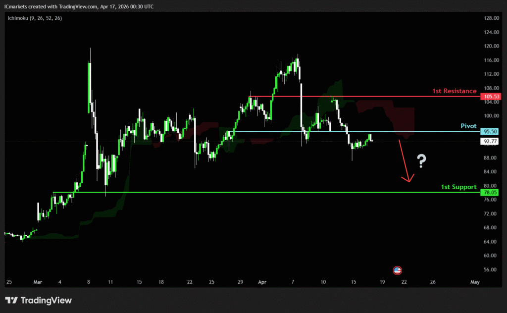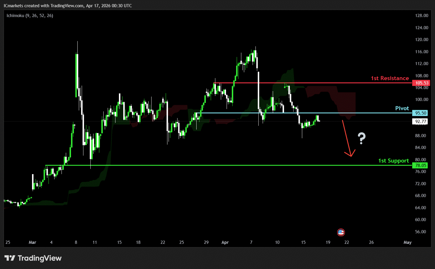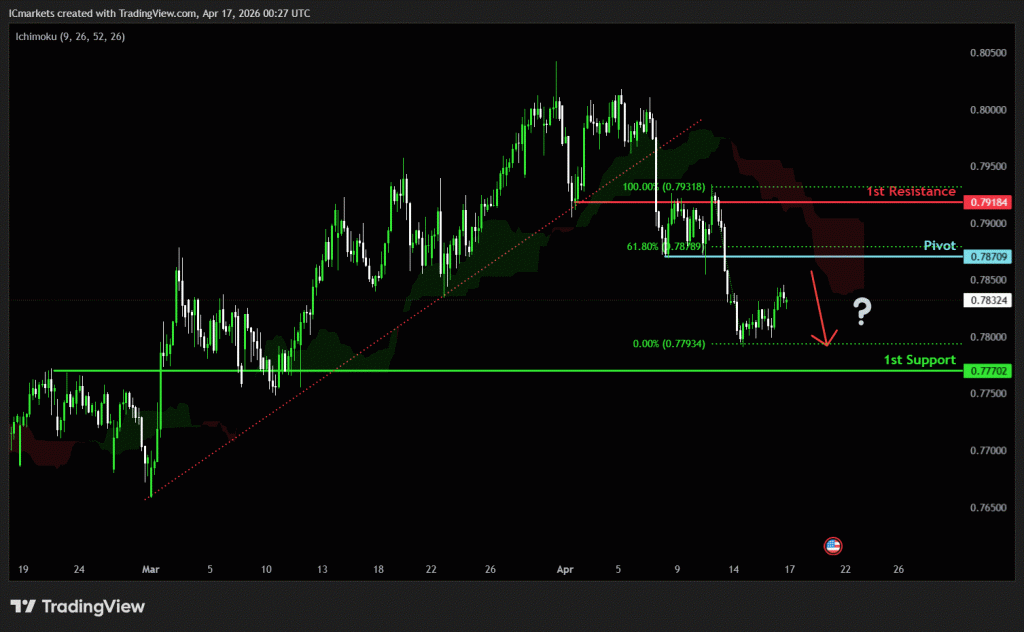 The price could see a short-term pullback toward the pivot before continuing its bearish move down toward the 1st support.