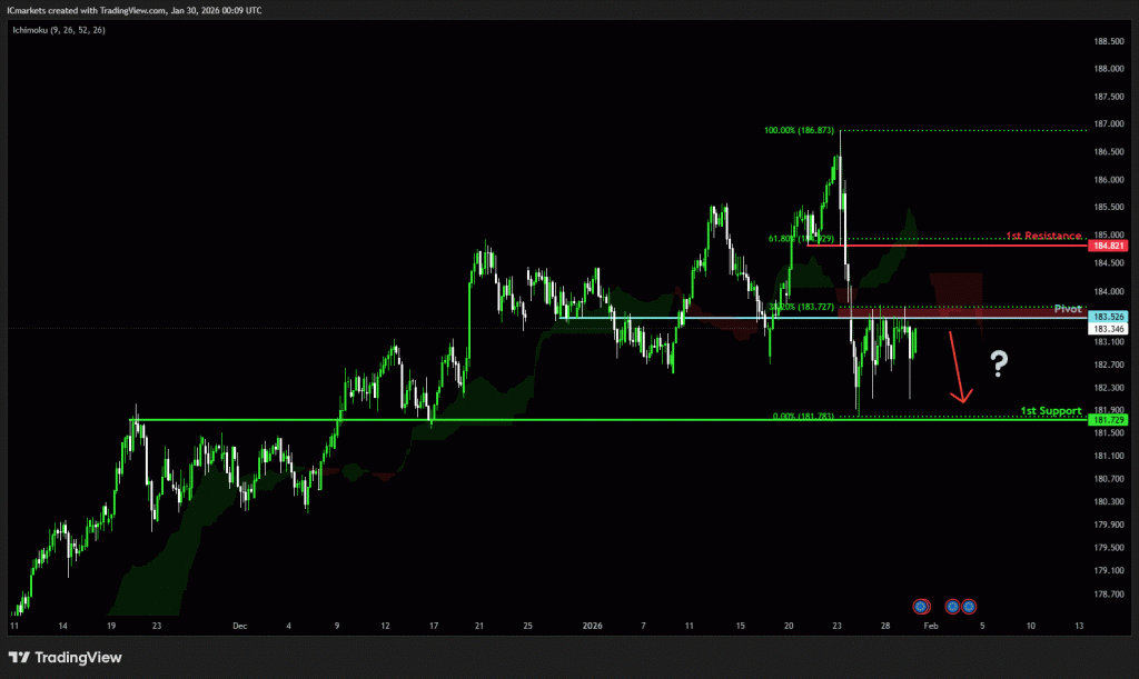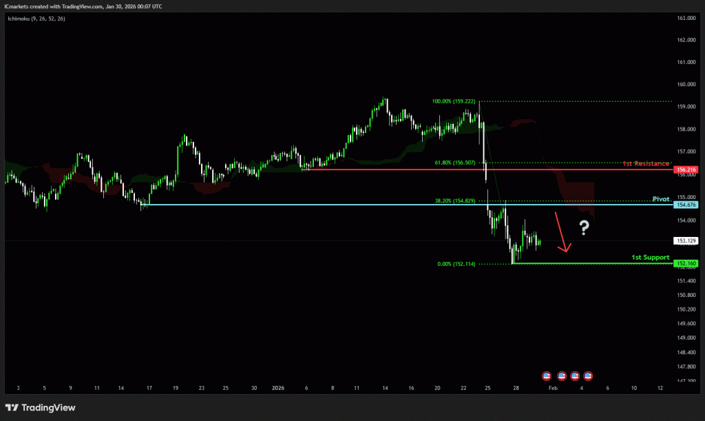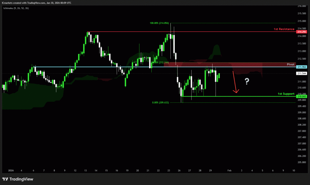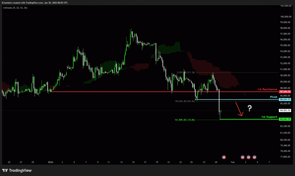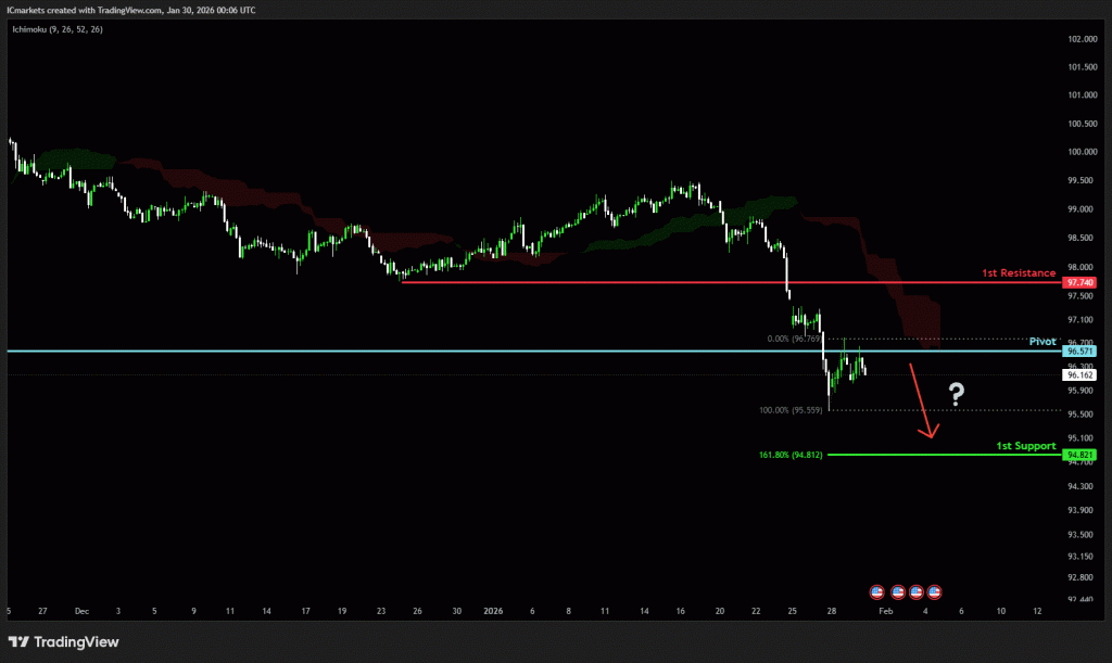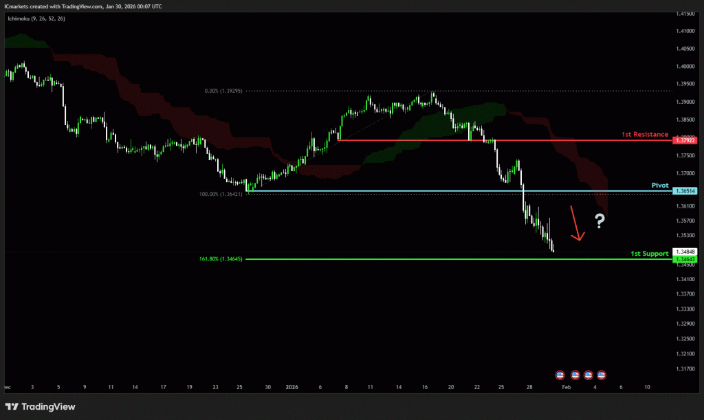 The price could see a short-term pullback toward the pivot before continuing its bearish move down toward the 1st support.