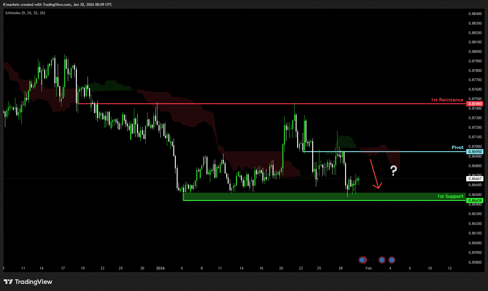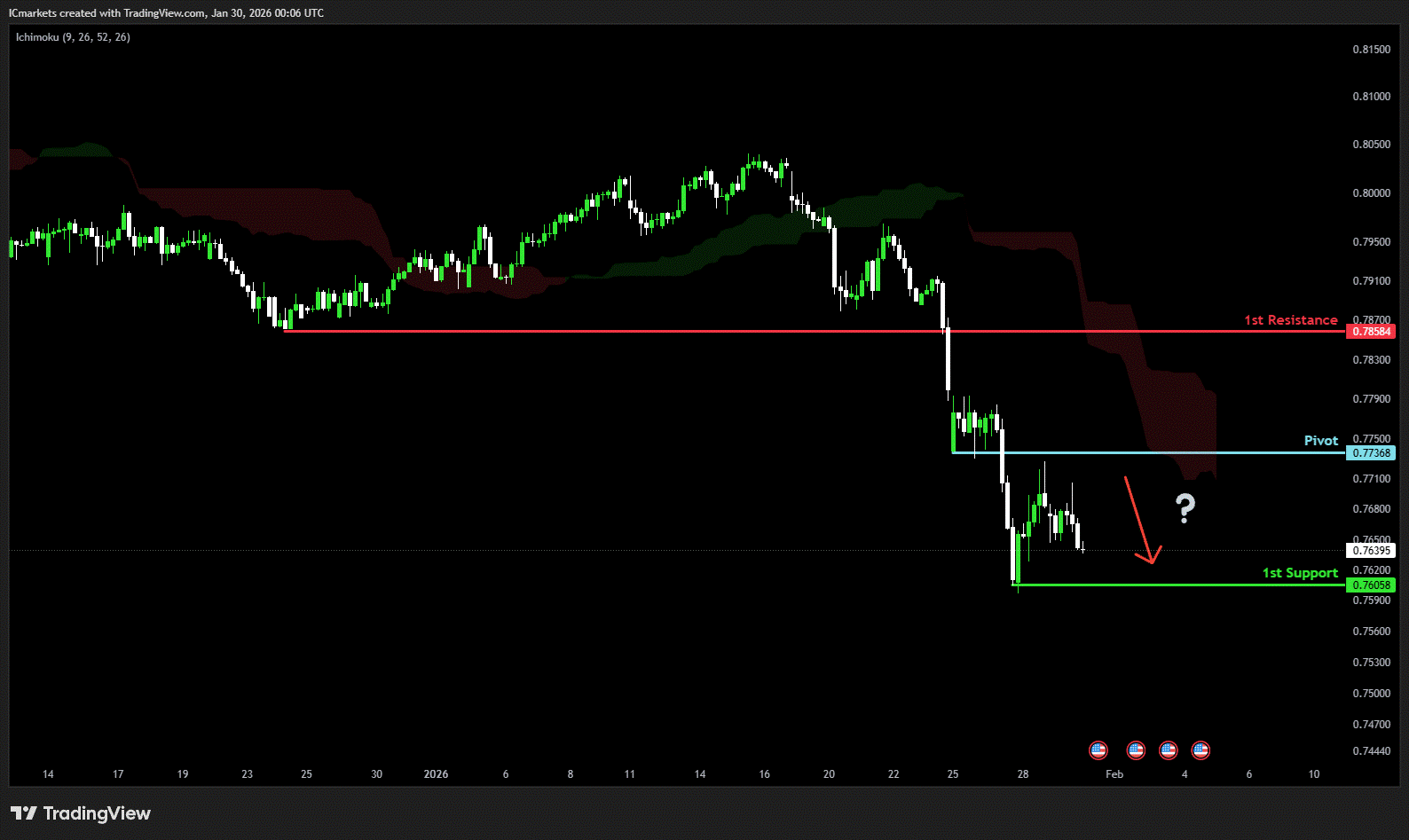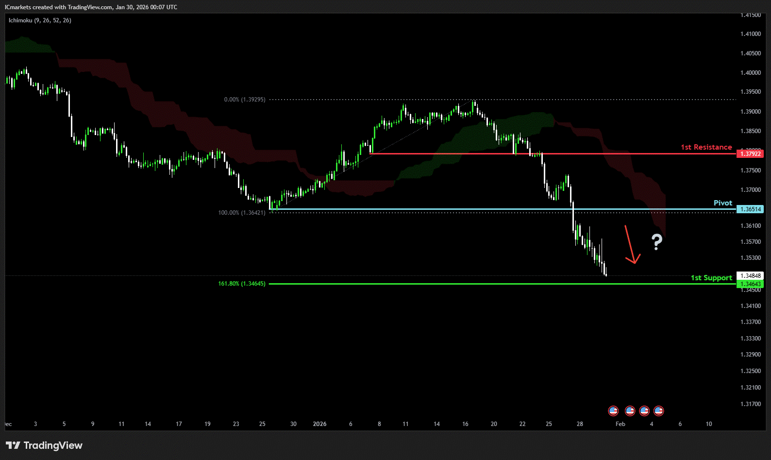 The price could see a short-term pullback toward the pivot before continuing its bearish move down toward the 1st support.