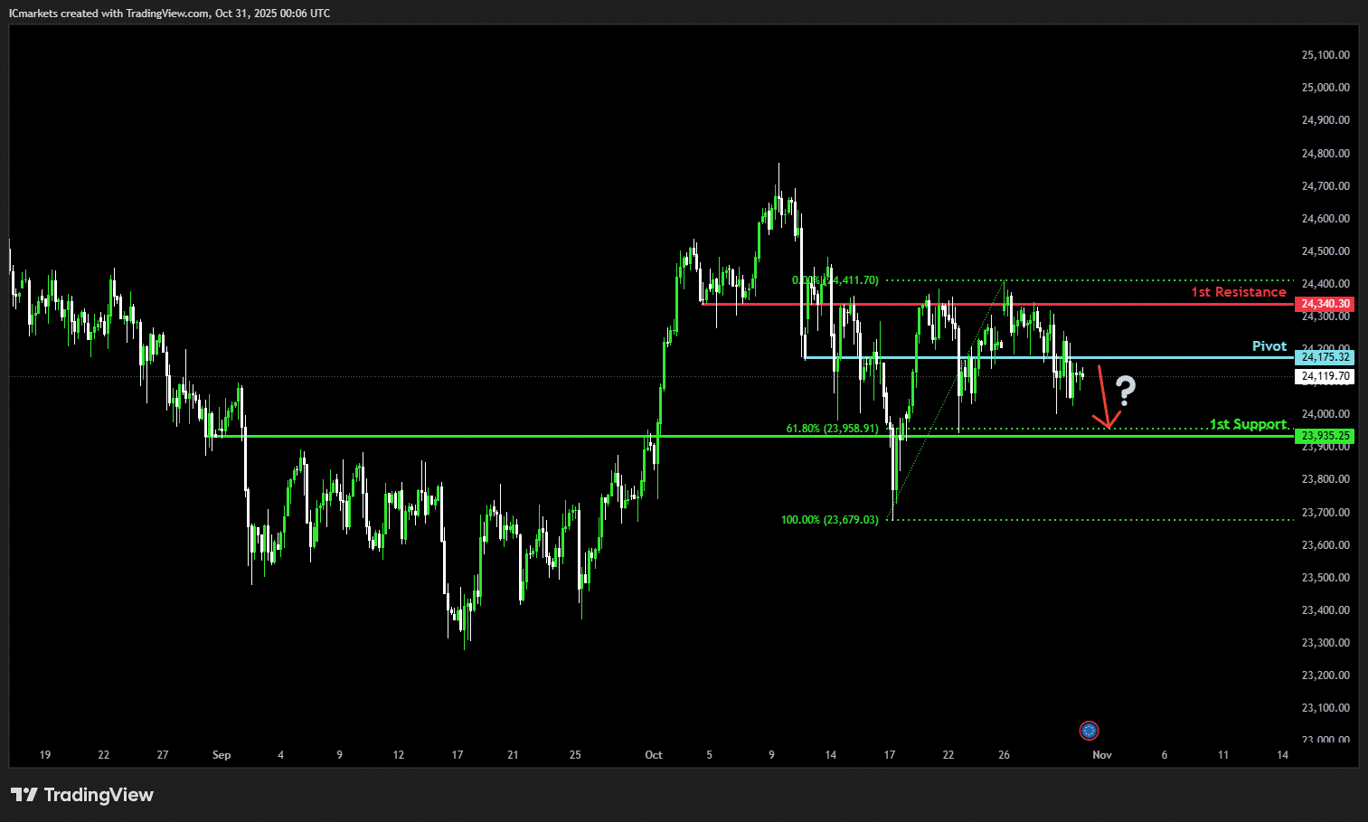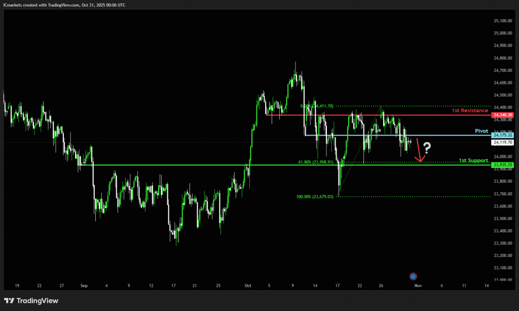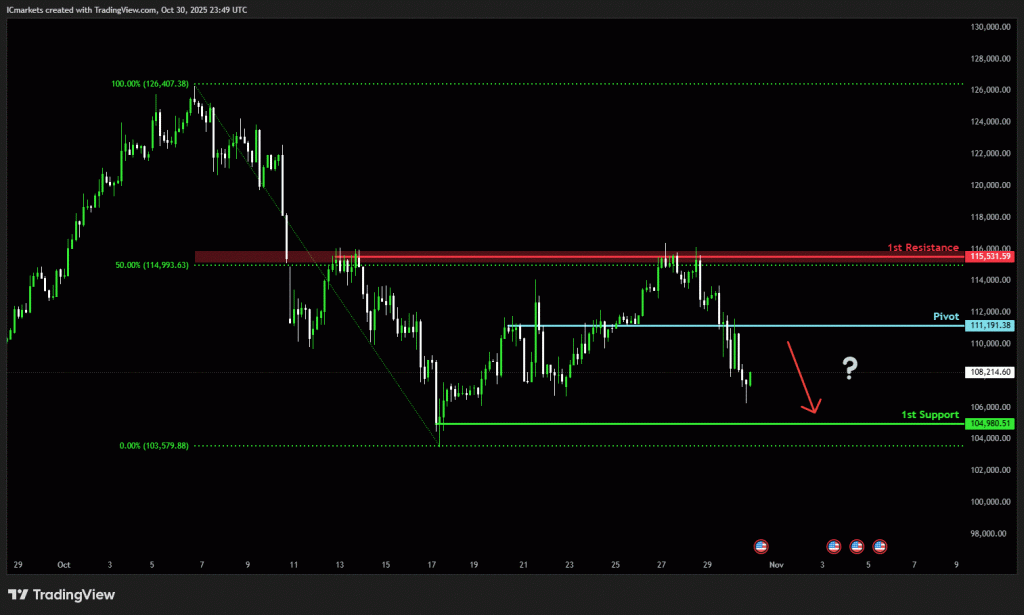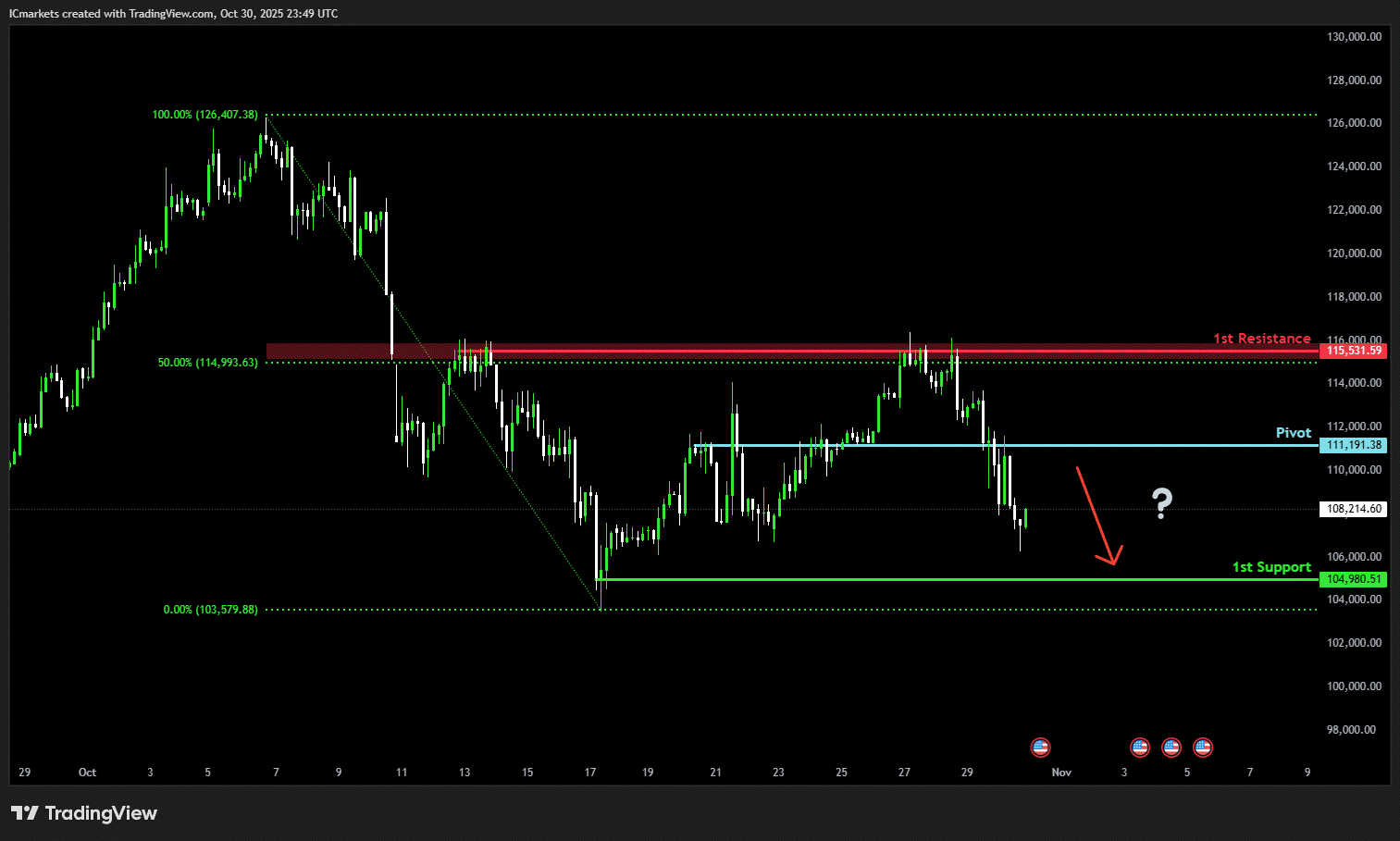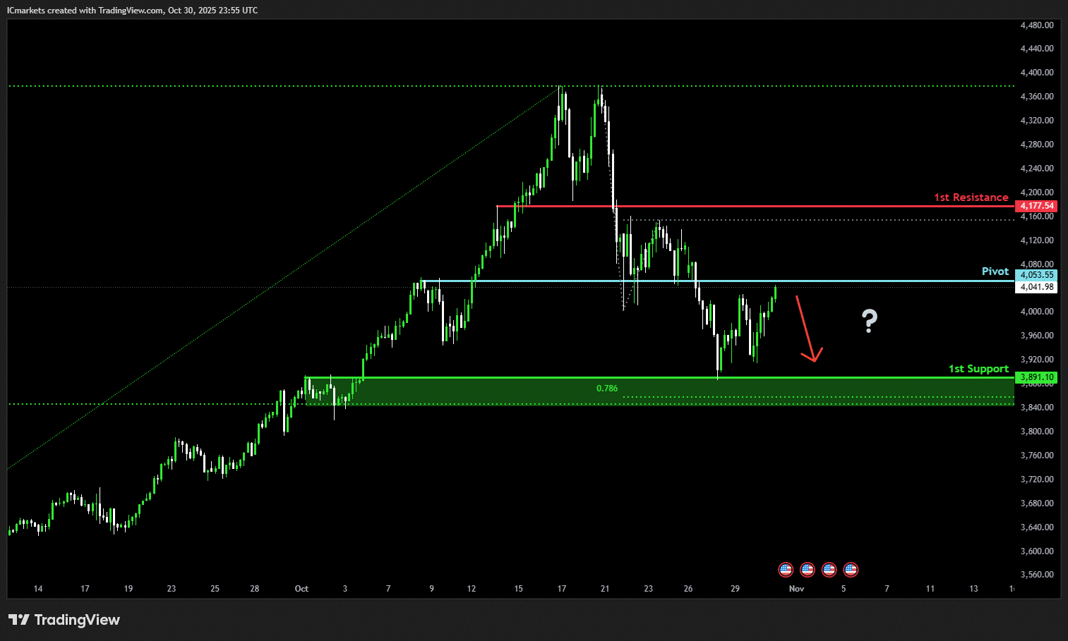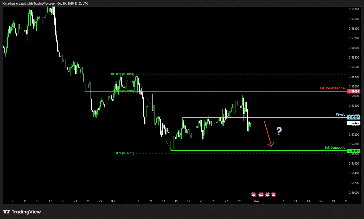 The price could see a short-term pullback toward the pivot before continuing its bearish move down toward the 1st support.