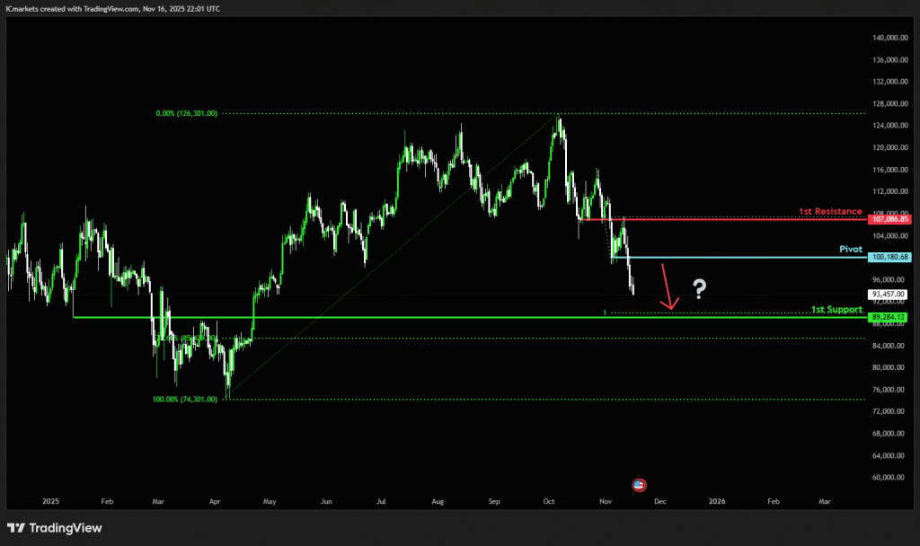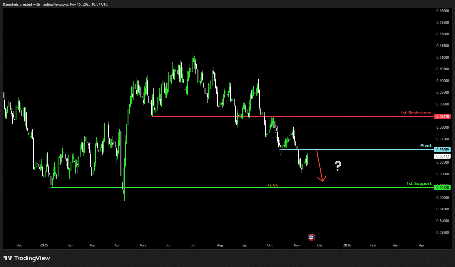 The price could see a short-term pullback toward the pivot before continuing its bearish move down toward the 1st support.