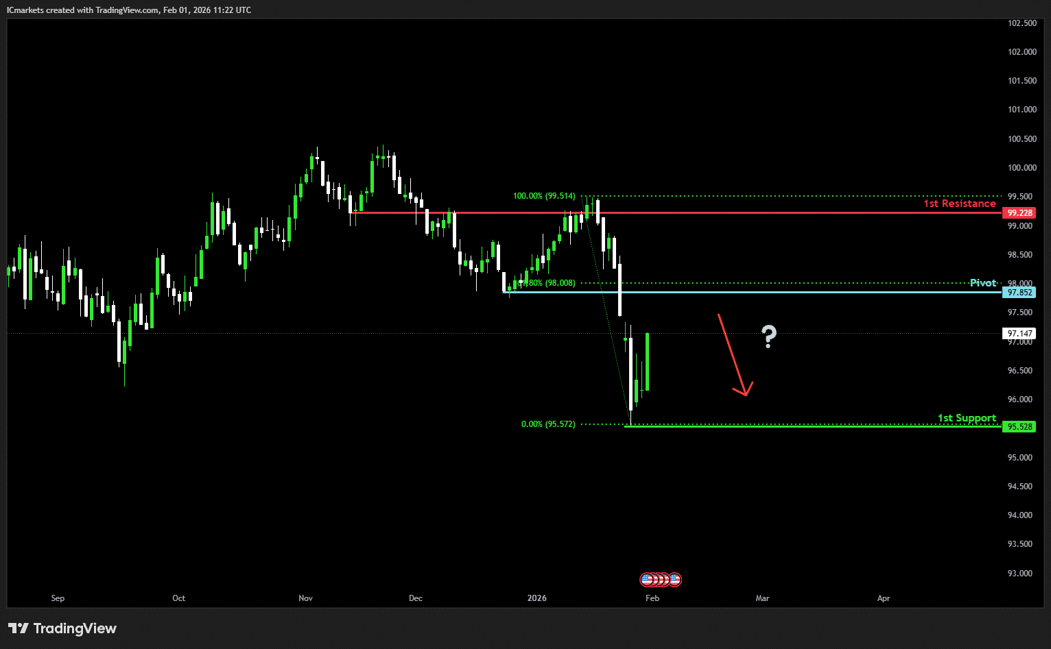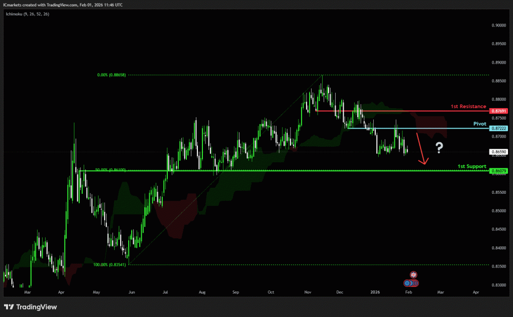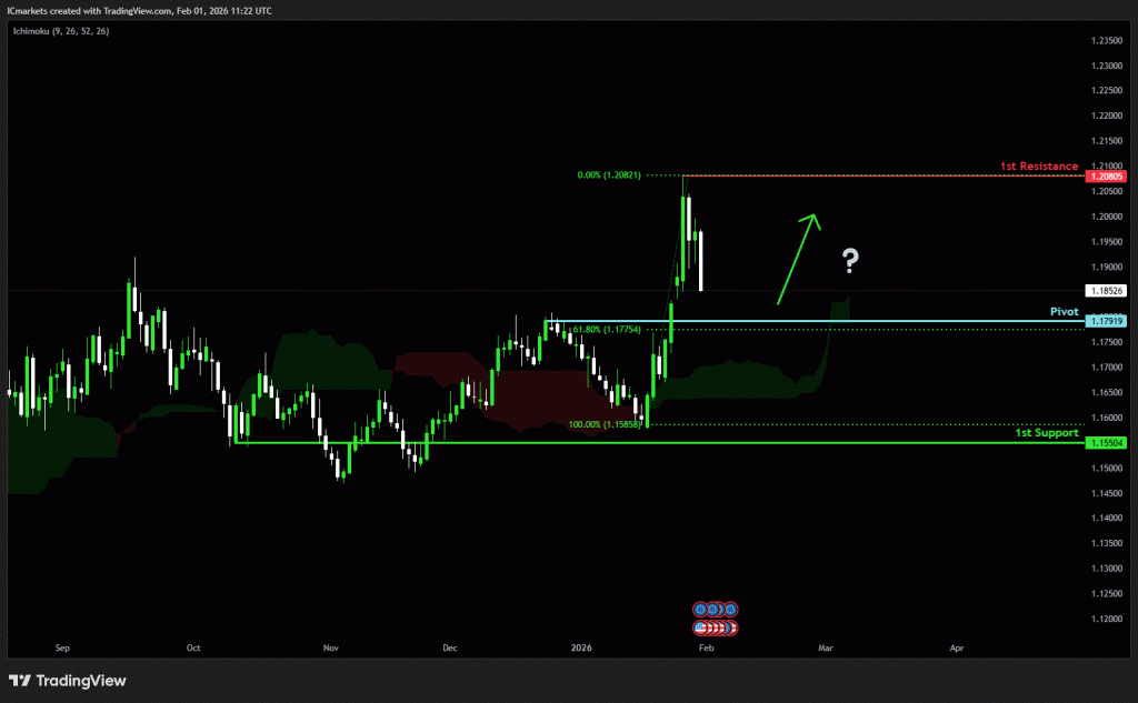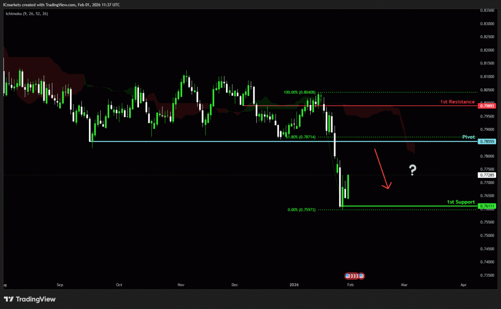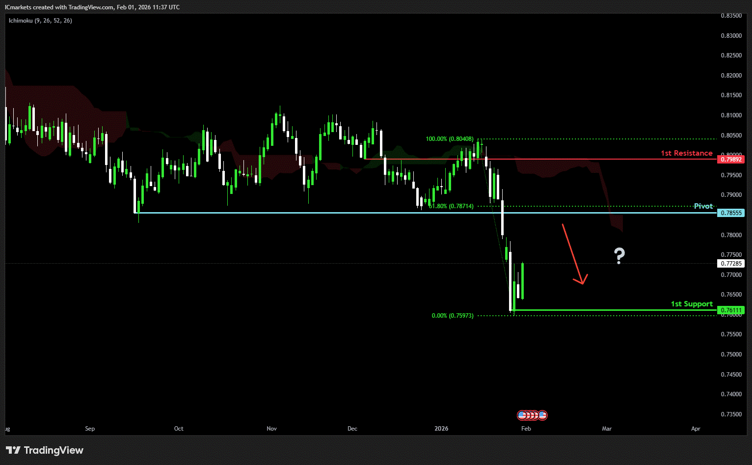 The price could see a short-term pullback toward the pivot before continuing its bearish move down toward the 1st support.