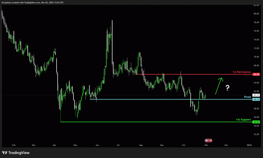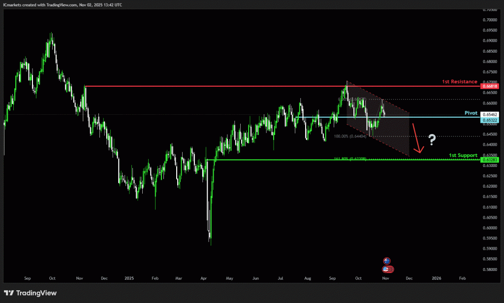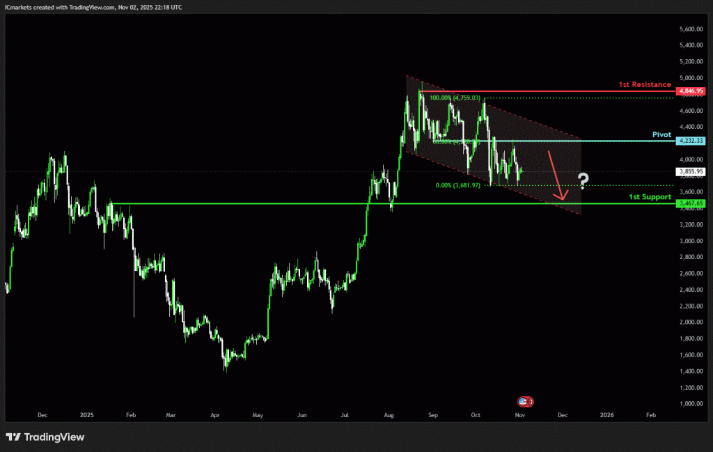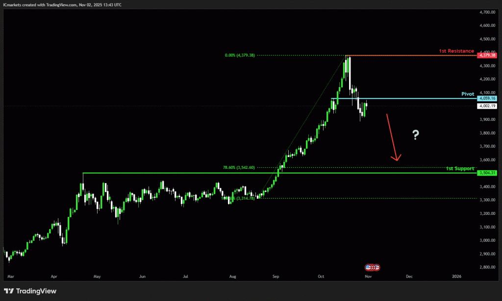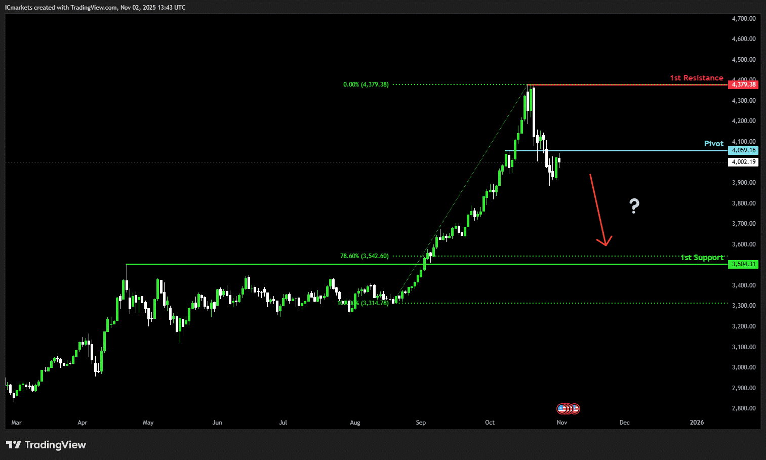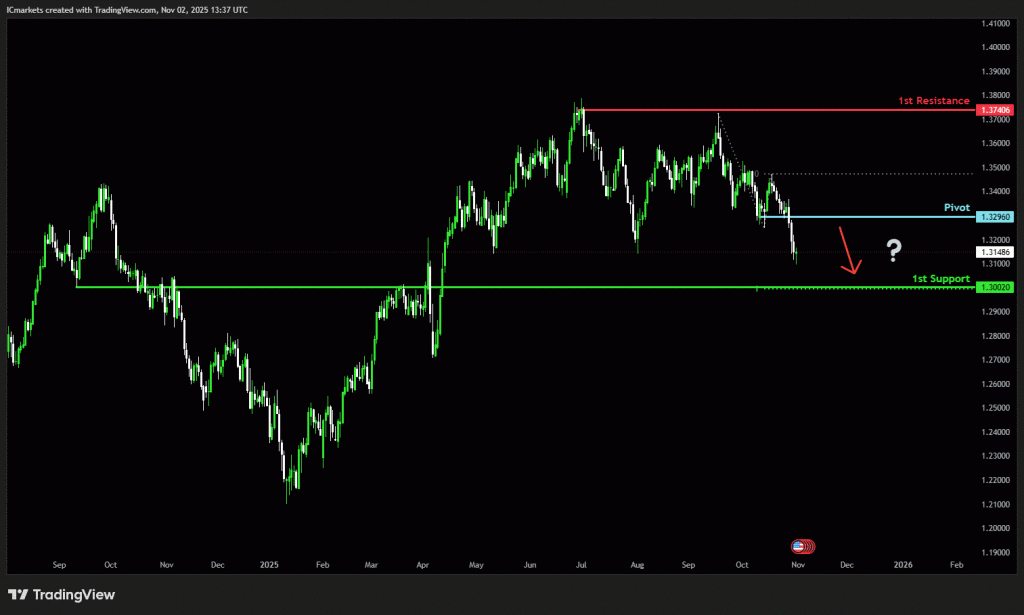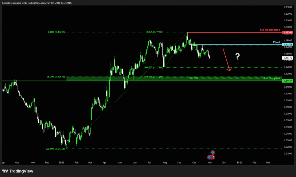 The price could see a short-term pullback toward the pivot before continuing its bearish move down toward the 1st support.