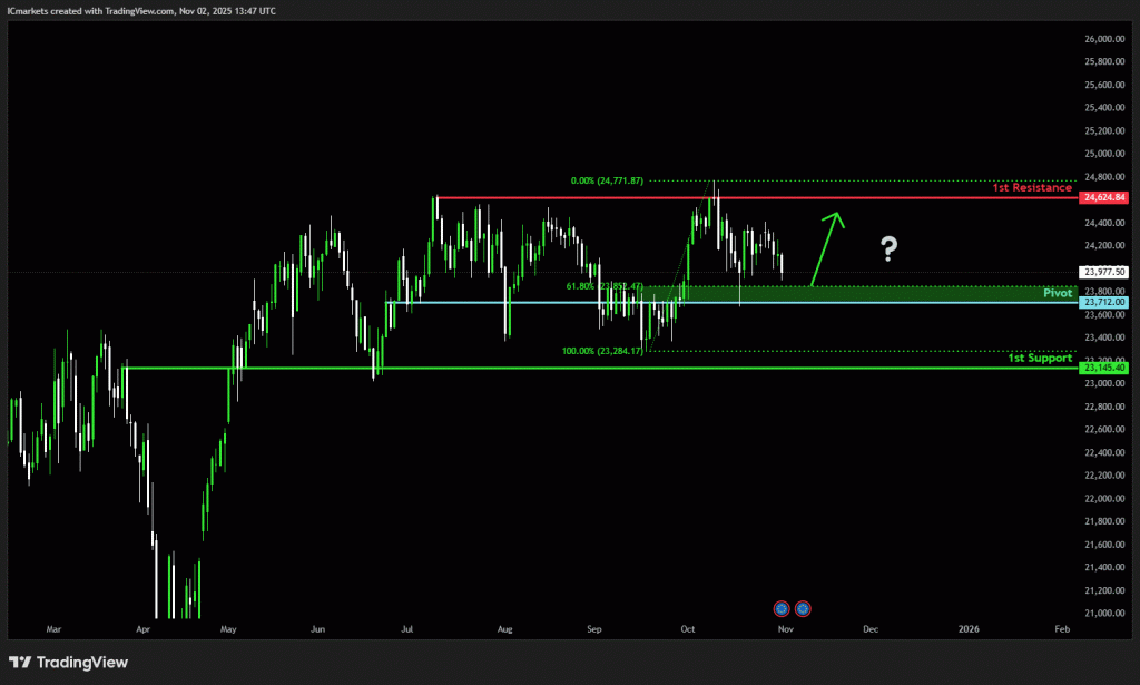 Supporting reasons: Identified as an overlap support that aligns with the 61.8% Fibonacci retracement, where renewed buying pressure could emerge to push the price higher.