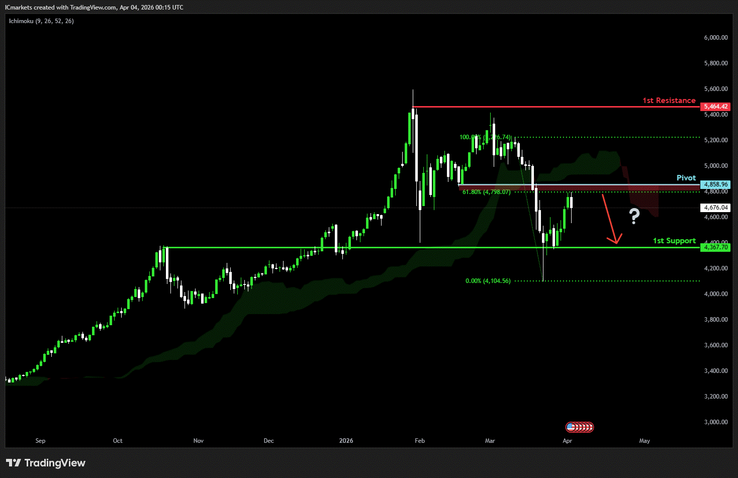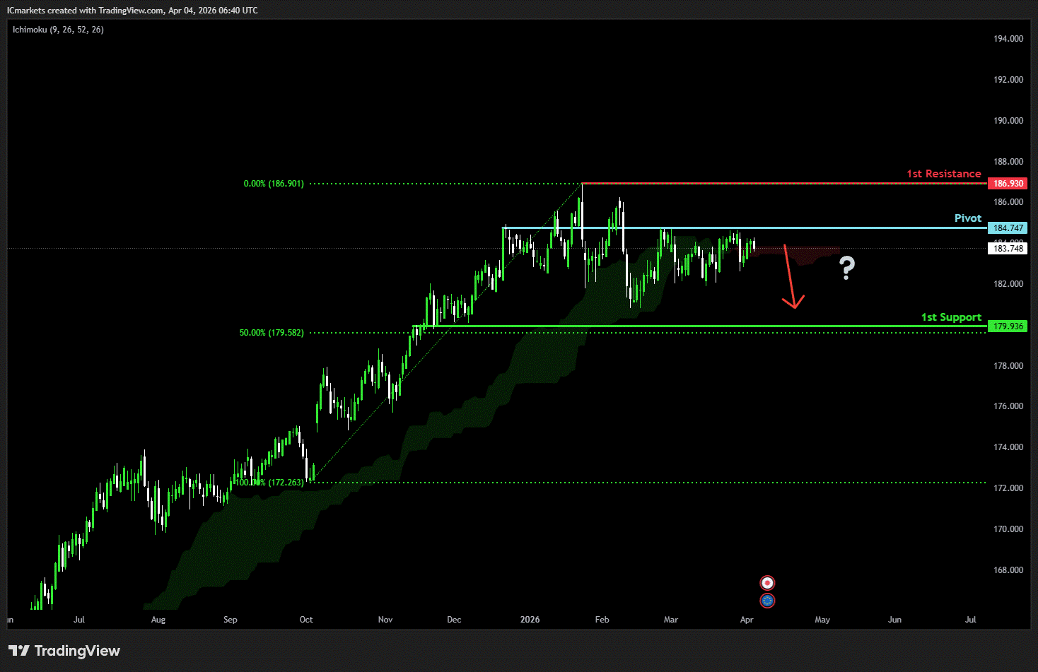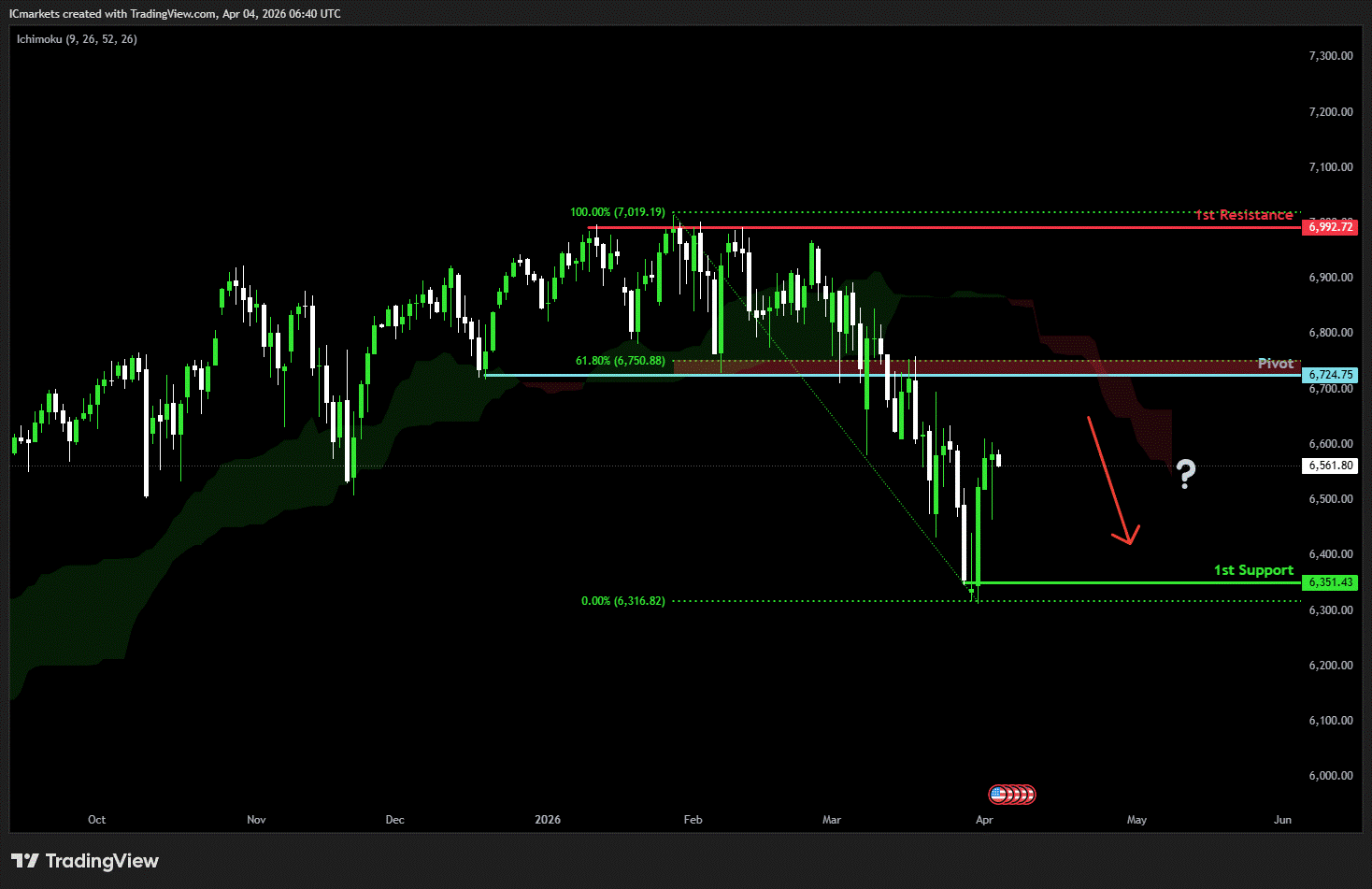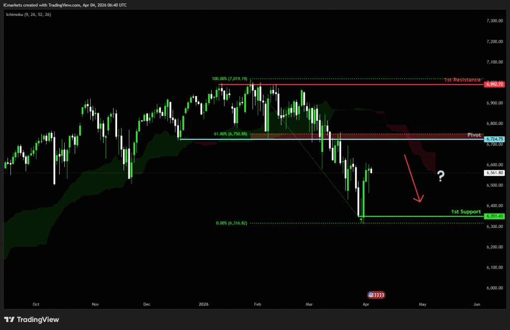 The price could see a short-term pullback toward the pivot before continuing its bearish move down toward the 1st support.