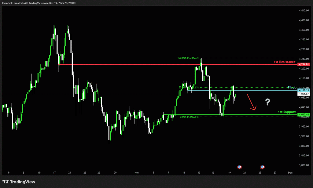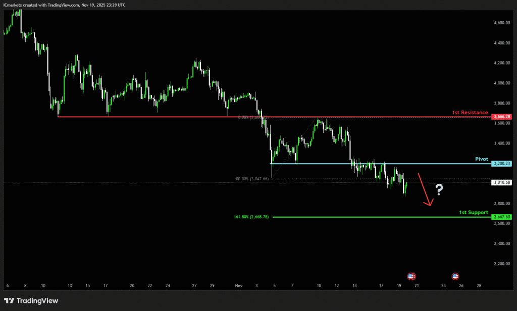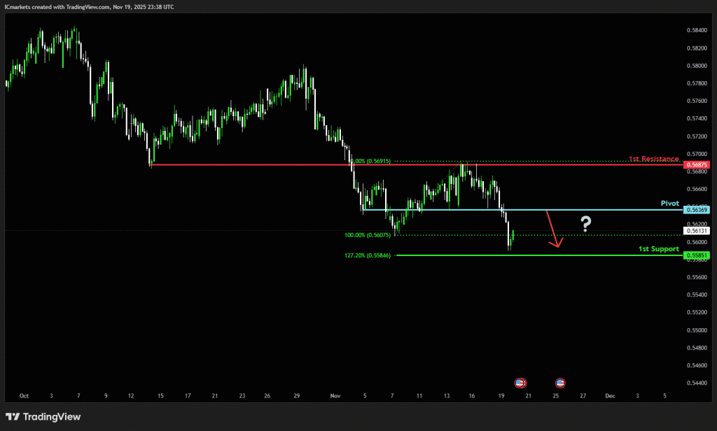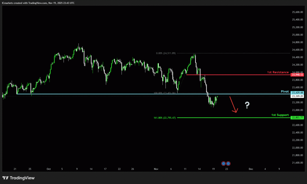 The price could see a short-term pullback toward the pivot before continuing its bearish move down toward the 1st support.