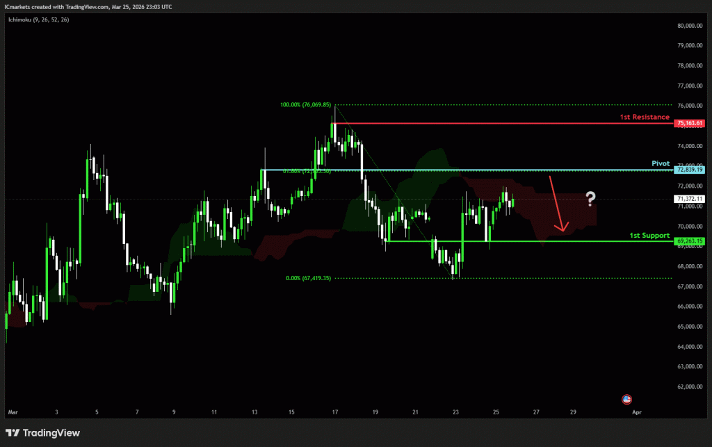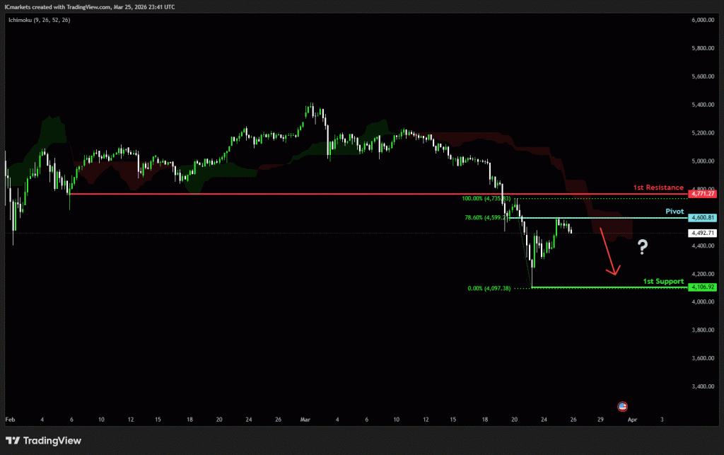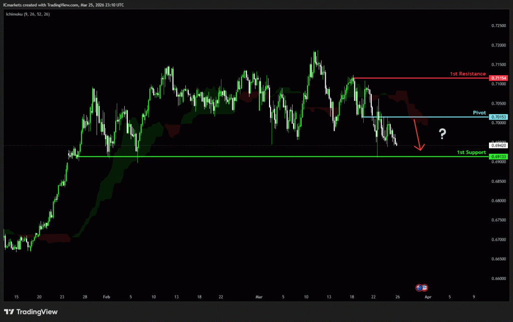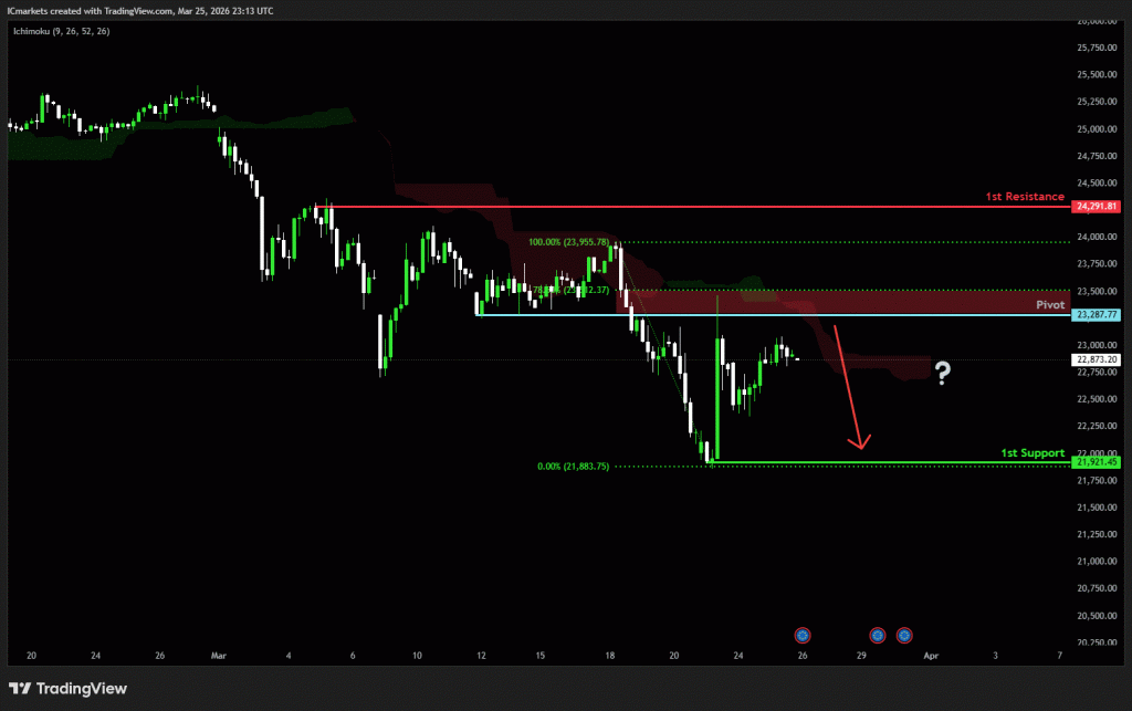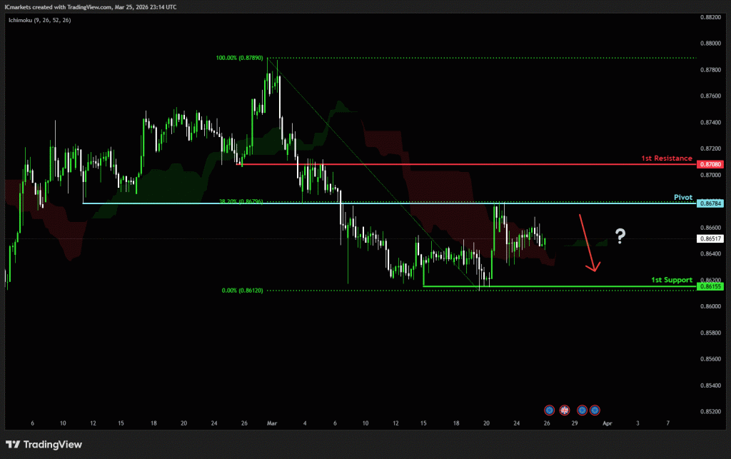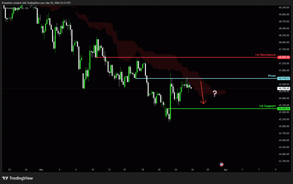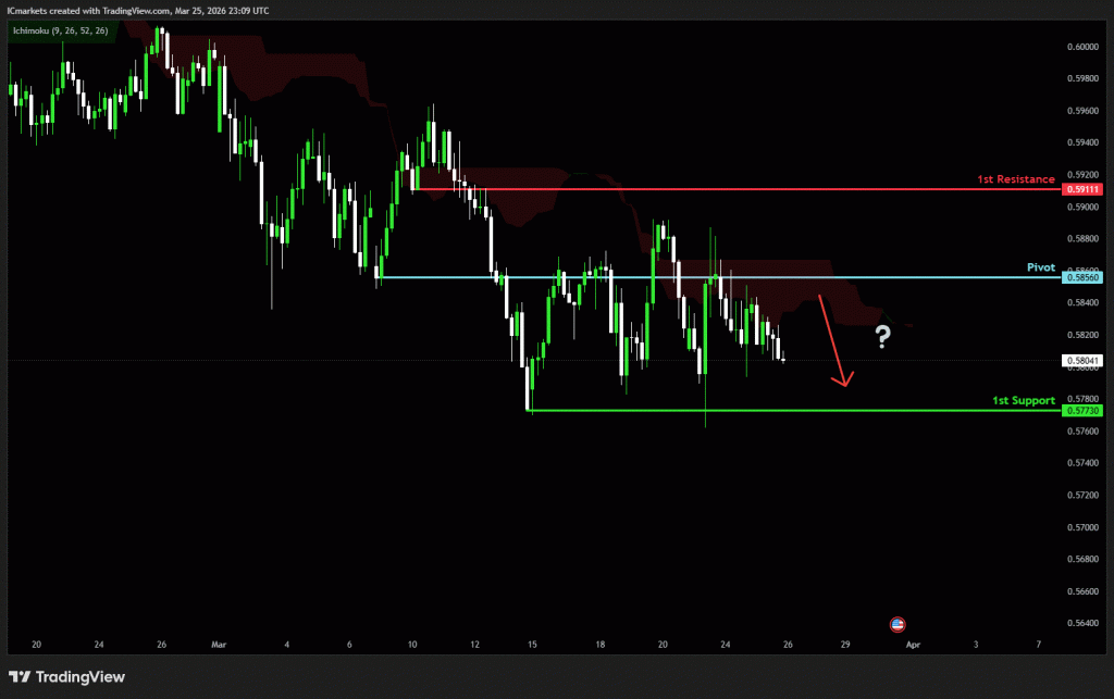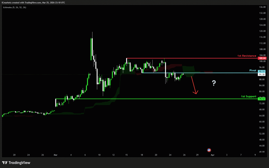 The price could see a short-term pullback toward the pivot before continuing its bearish move down toward the 1st support.