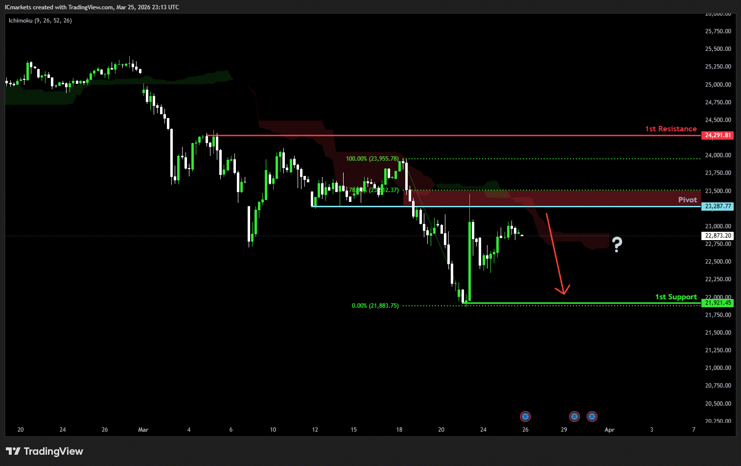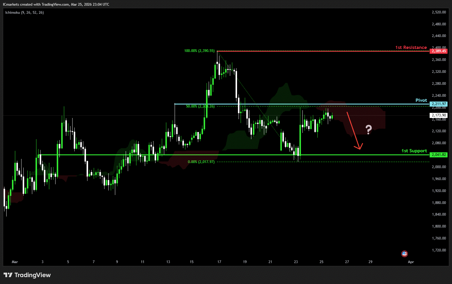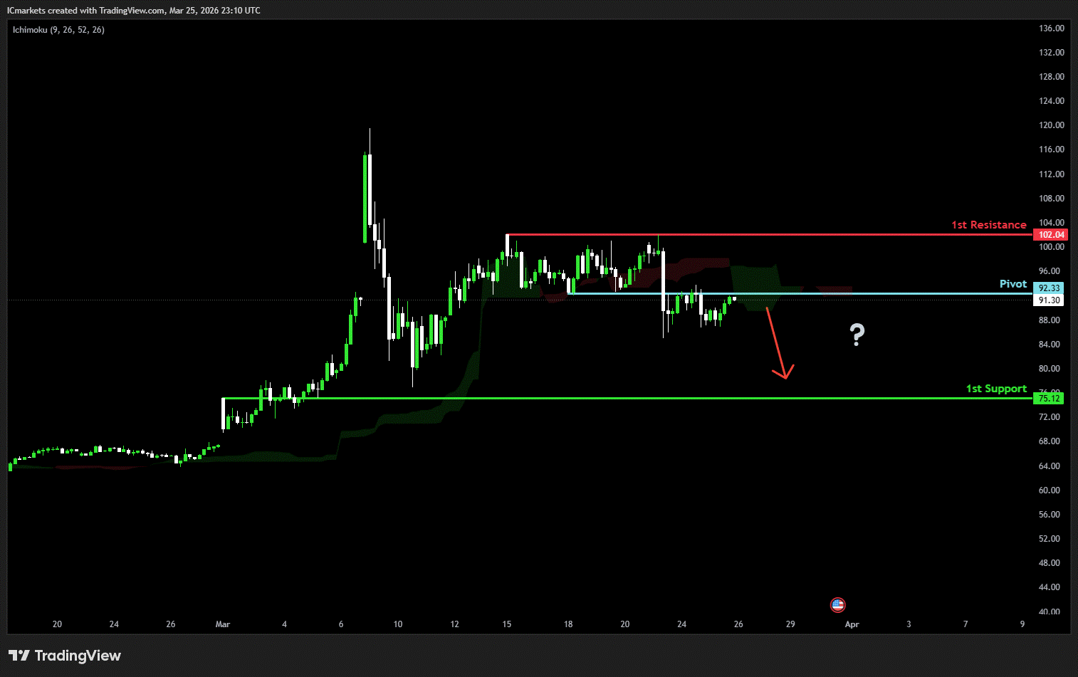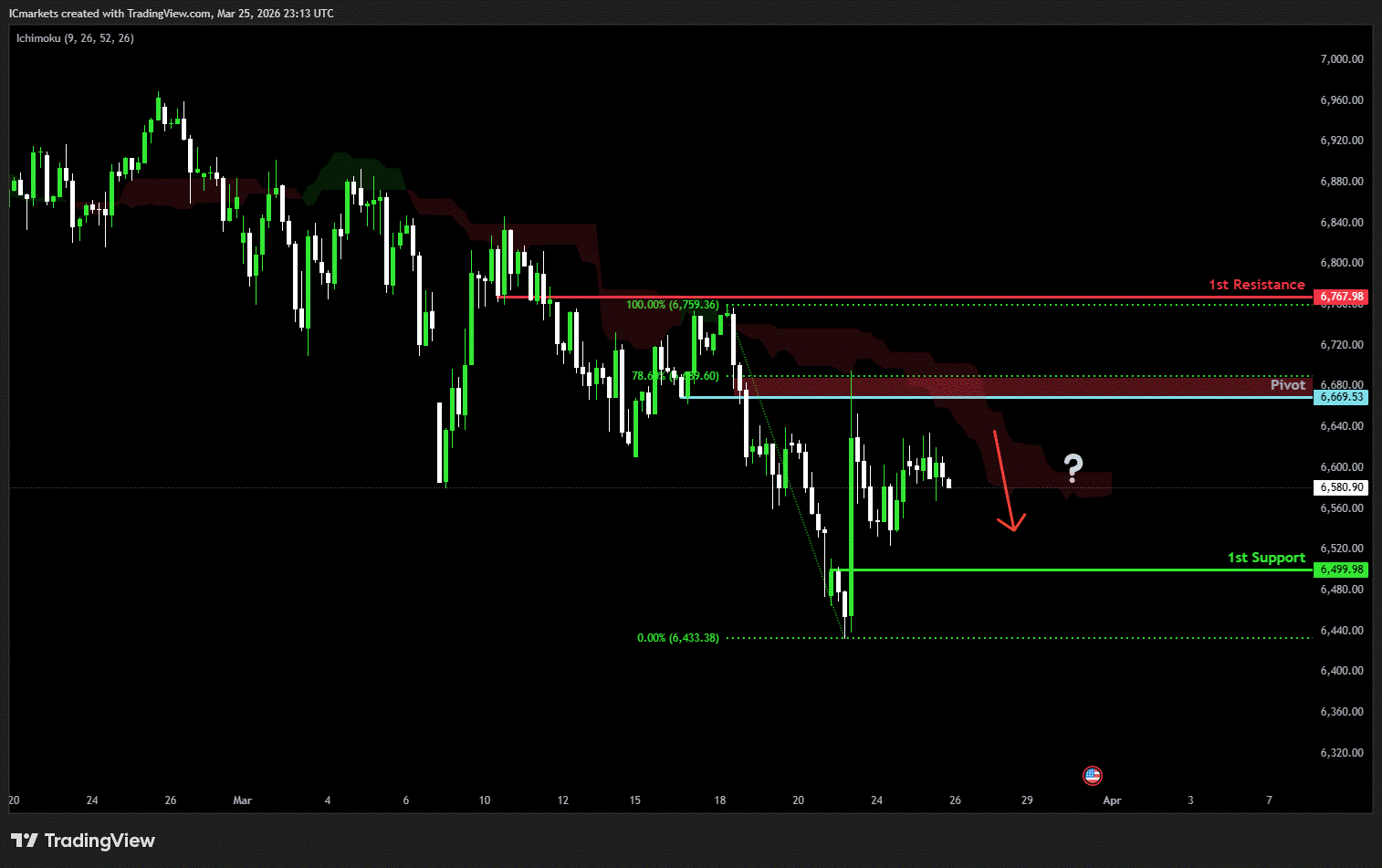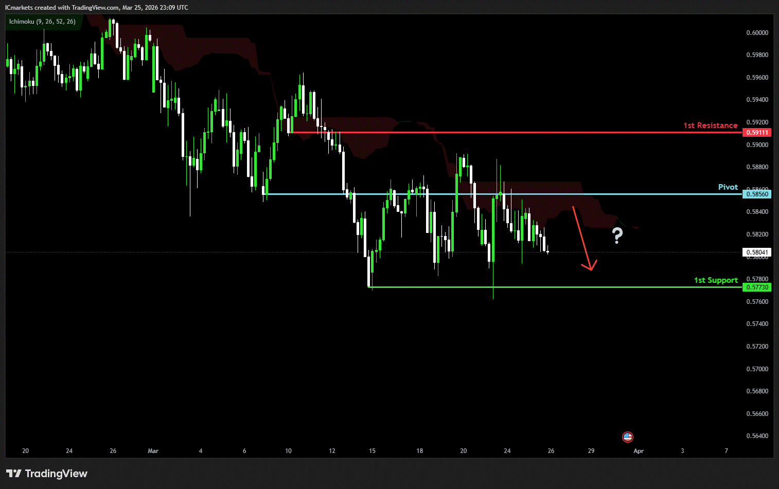 The price could see a short-term pullback toward the pivot before continuing its bearish move down toward the 1st support.