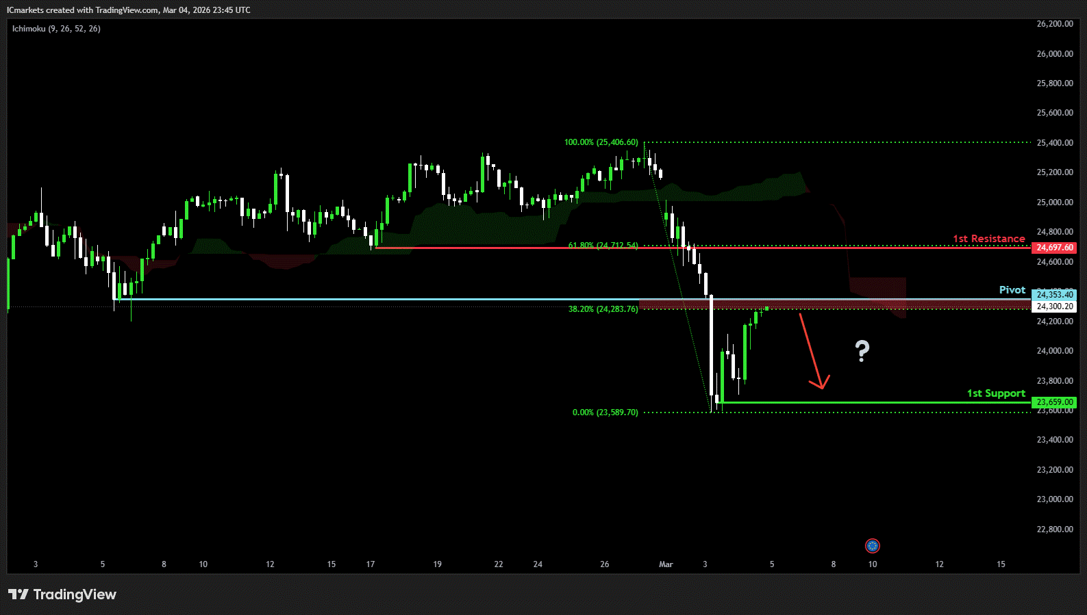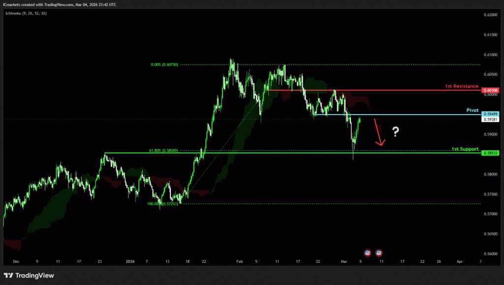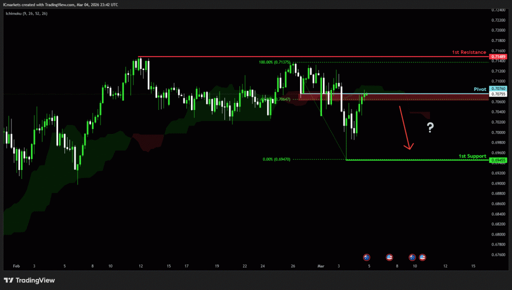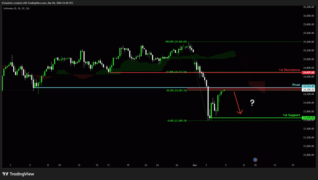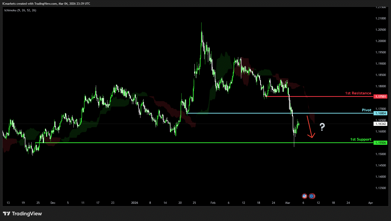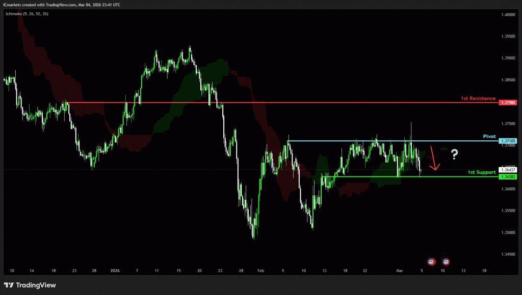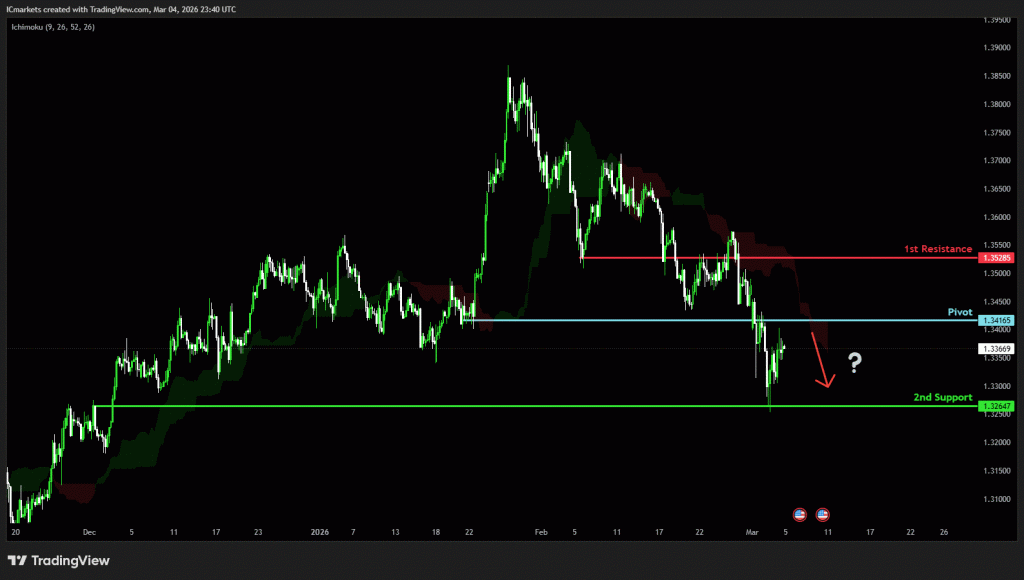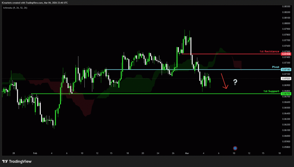 The price could see a short-term pullback toward the pivot before continuing its bearish move down toward the 1st support.