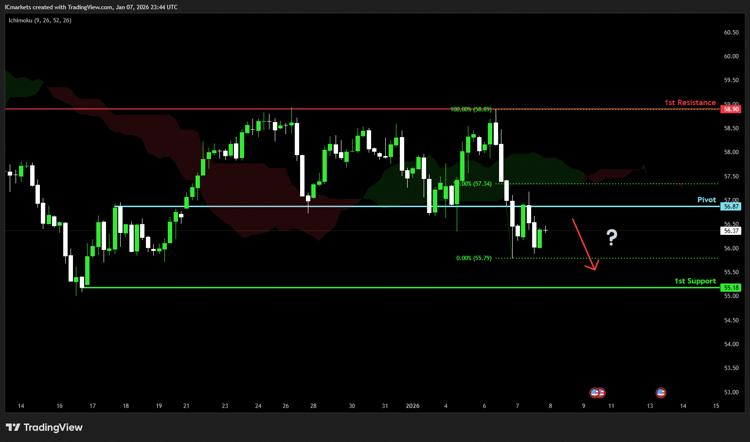 The price could see a short-term pullback toward the pivot before continuing its bearish move down toward the 1st support.