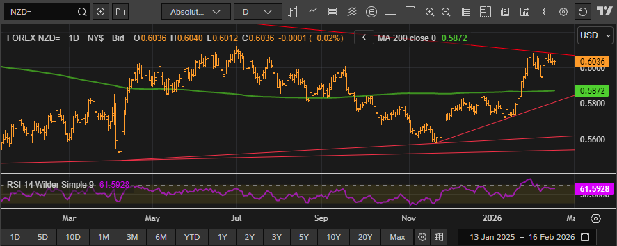 The Kiwi dollar has largely remained under a low profile for the first weeks of the new trading year as some of the bigger major currencies have grabbed the limelight, however it will be squarely in focus on Wednesday when the Reserve Bank of New Zealand announces its latest interest rate decision. Along with its cross Tasman cousin, the Aussie, the Kiwi has had a strong run against the dollar for the majority of 2026, gaining nearly 7% from its low of 0.5710 to its recent high just under 61 cents.