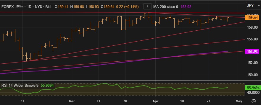 USDJPY is trading again near annual highs on the Daily Chart despite a hawkish leaning from the Bank of Japan this week and anything more hawkish from the FOMC at the conclusion of their latest meeting could see the annual high at 160.46 come under threat. Shorter-term resistance at recent highs and the trendline around the 159.86 level will probably give bulls good stop loss entry levels for a move higher, whilst bears would look to leverage them if we do have a more dovish outlook from the committee. Support on the short-term trendline now comes in around the 158.50 level with stronger levels now sitting down just under 156.00.