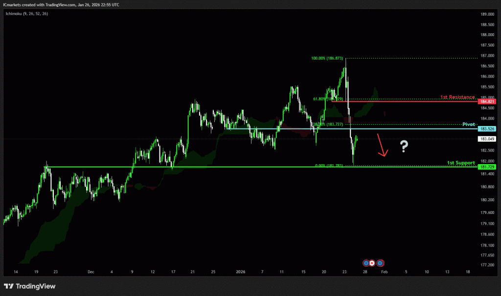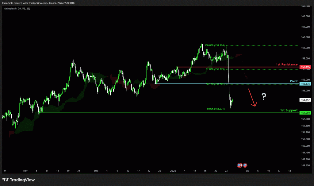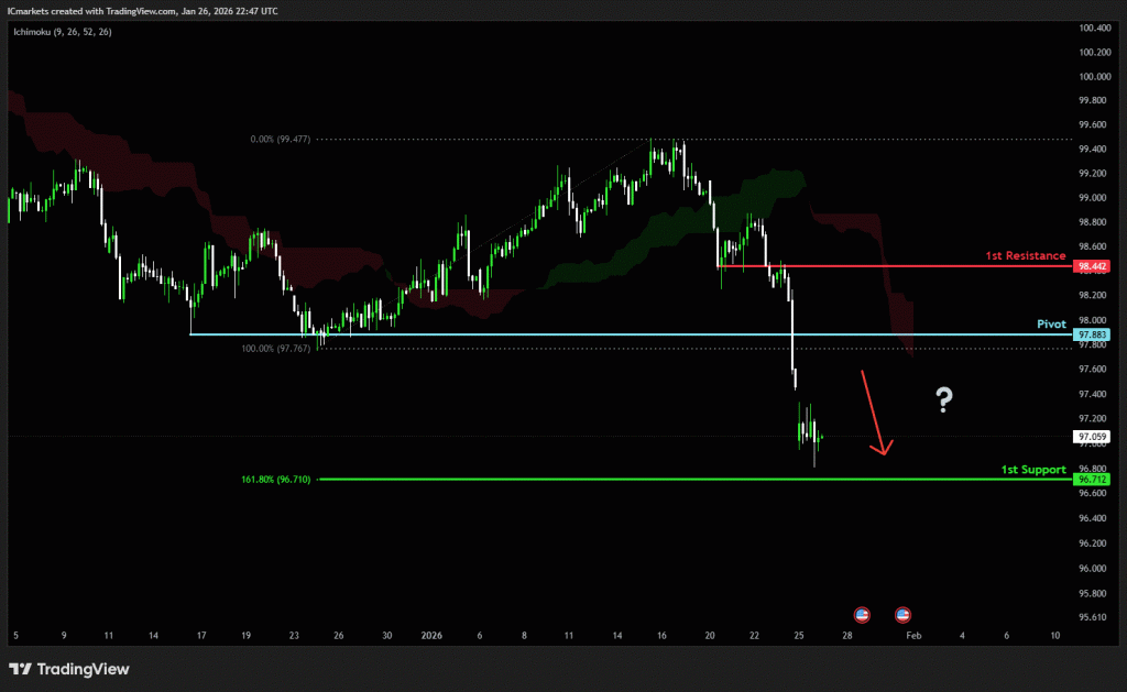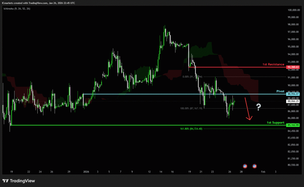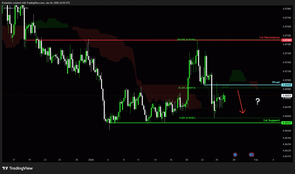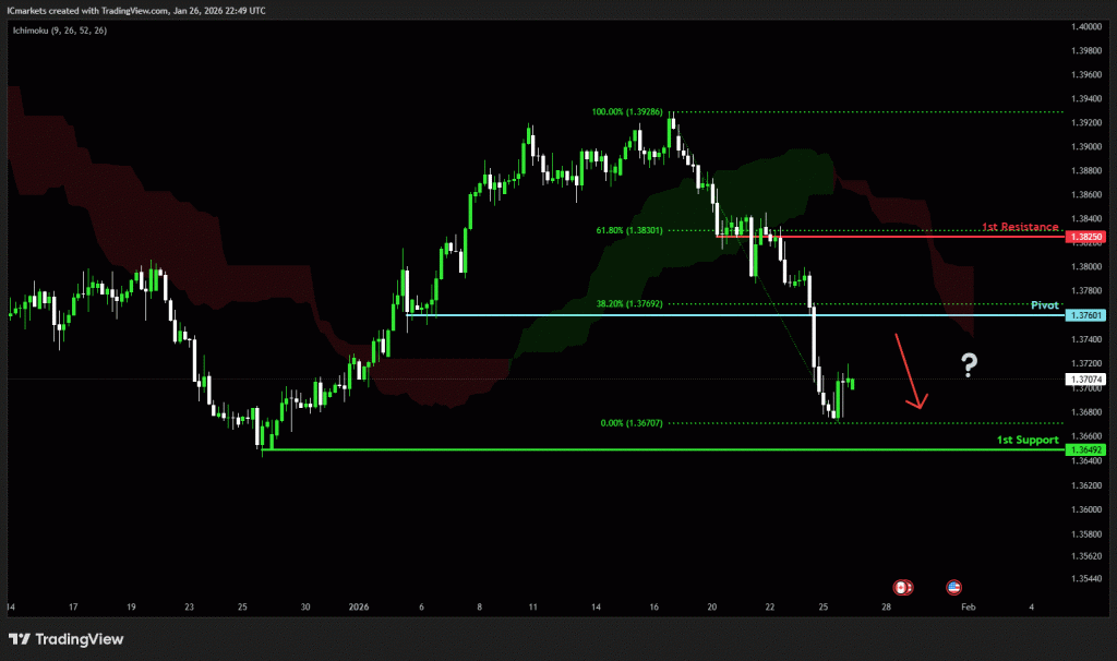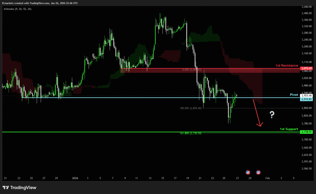 The price could see a short-term pullback toward the pivot before continuing its bearish move down toward the 1st support.