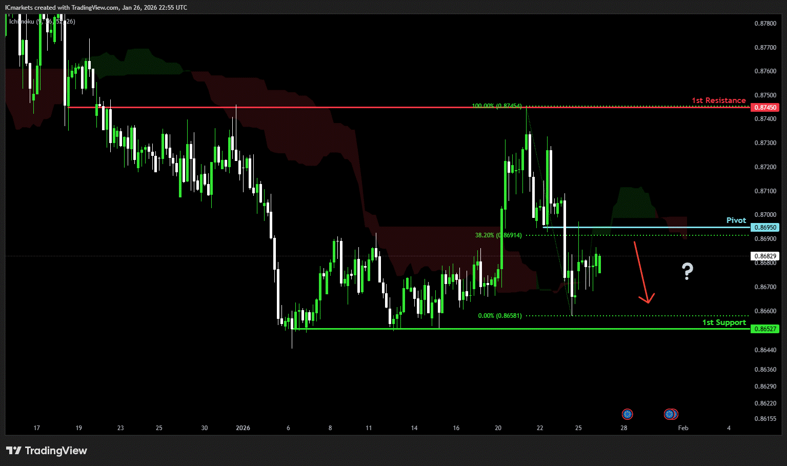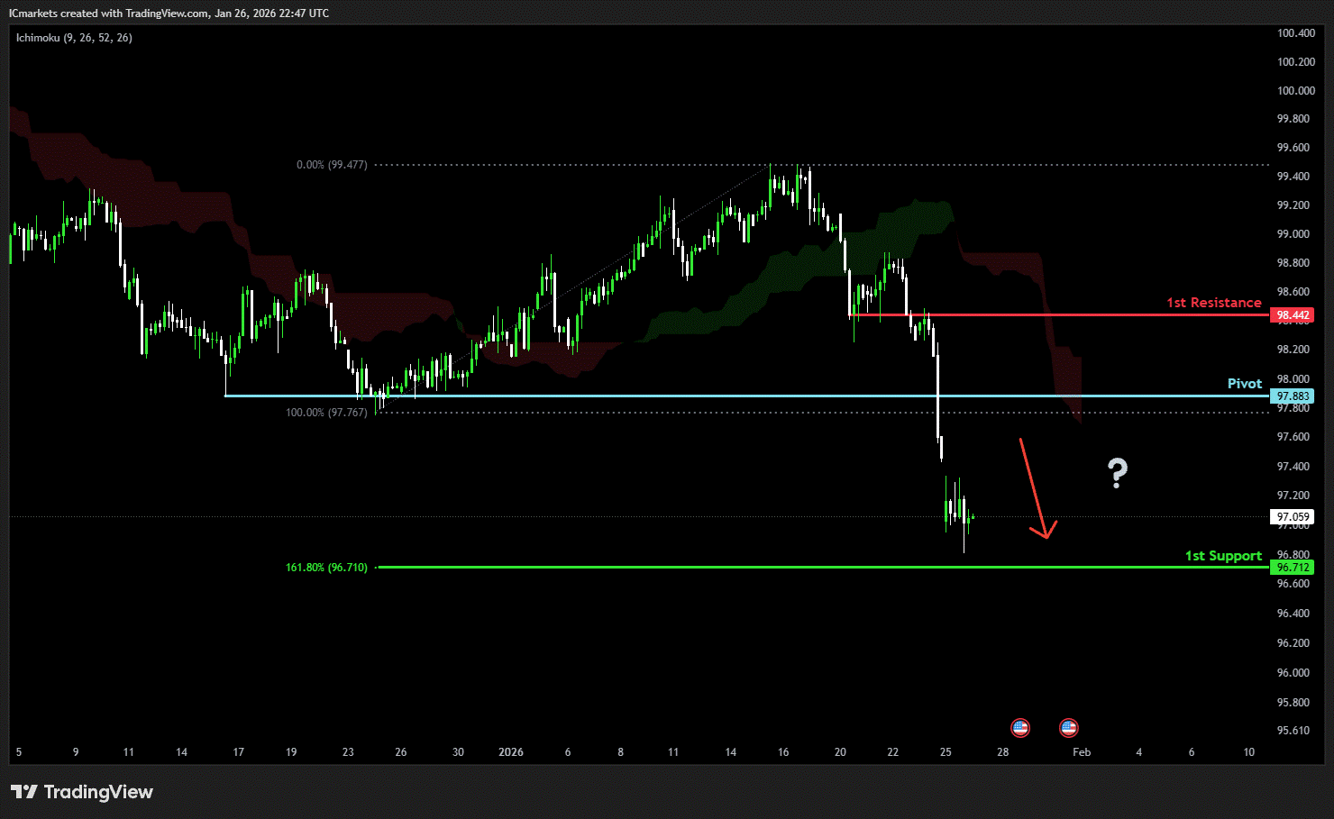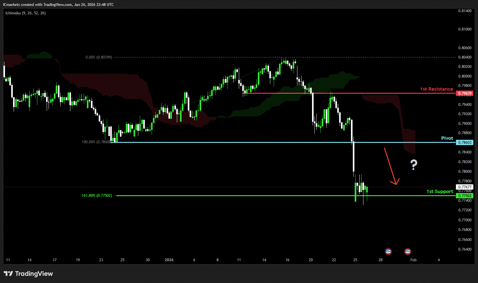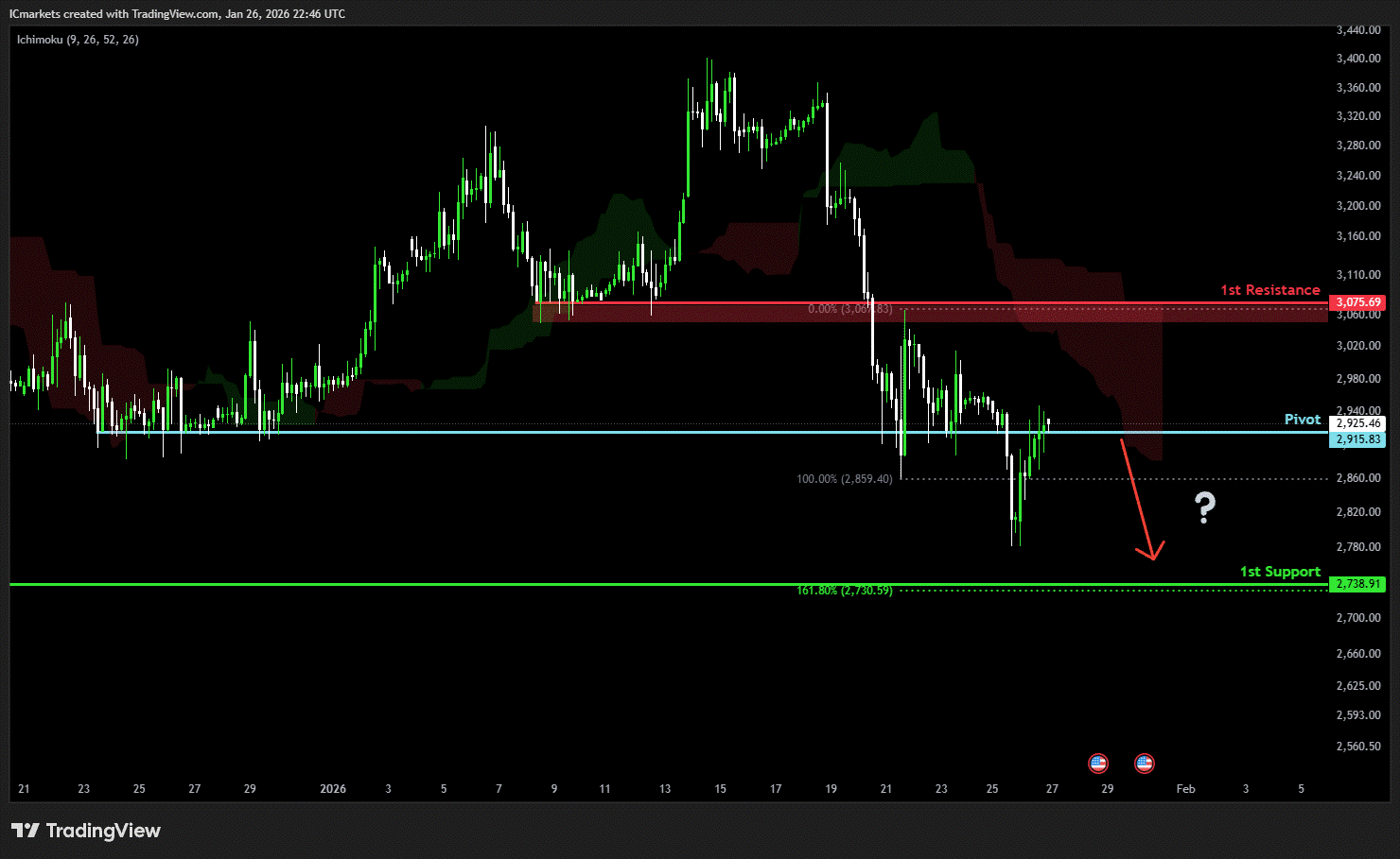The price could see a short-term pullback toward the pivot before continuing its bearish move down toward the 1st support.