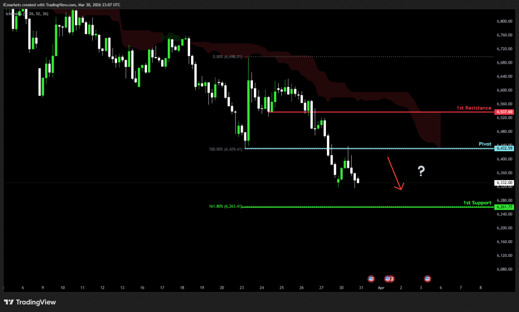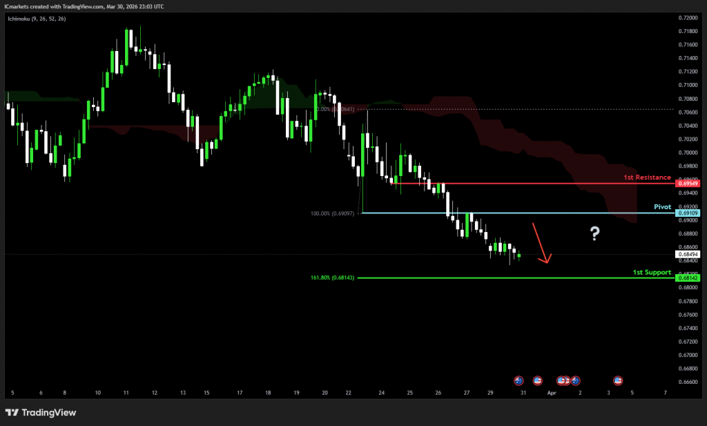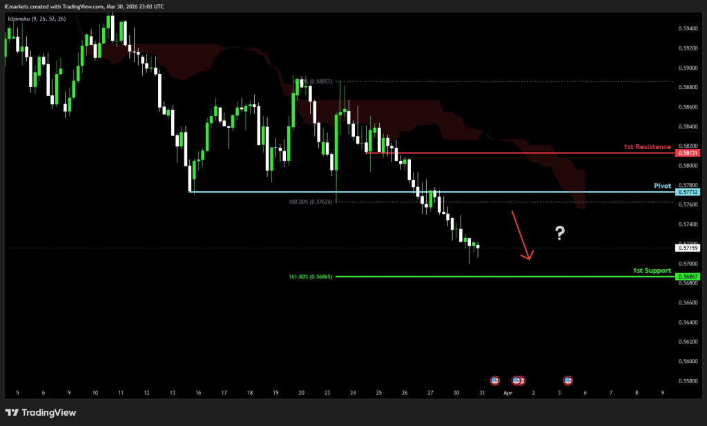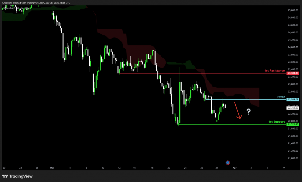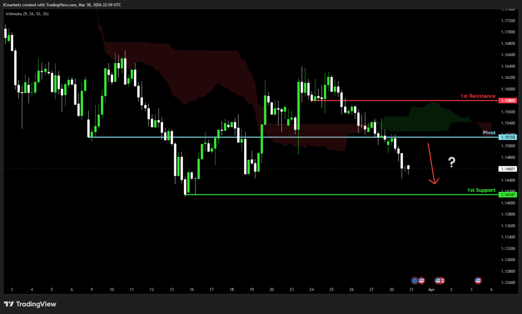 The price could see a short-term pullback toward the pivot before continuing its bearish move down toward the 1st support.
