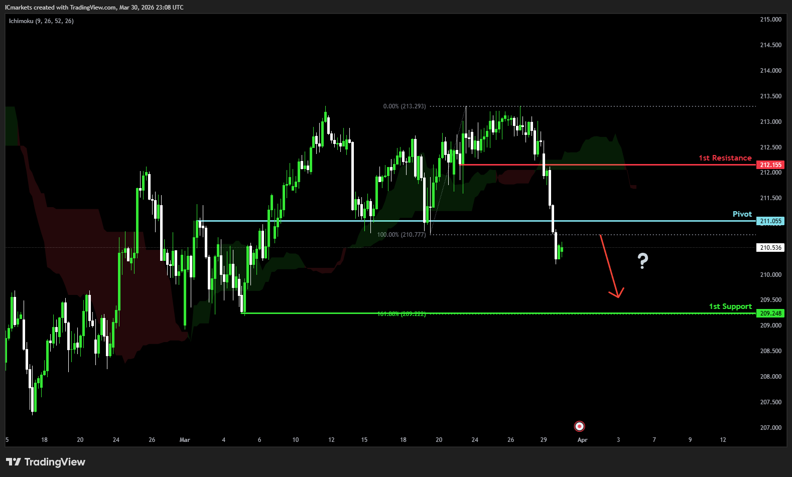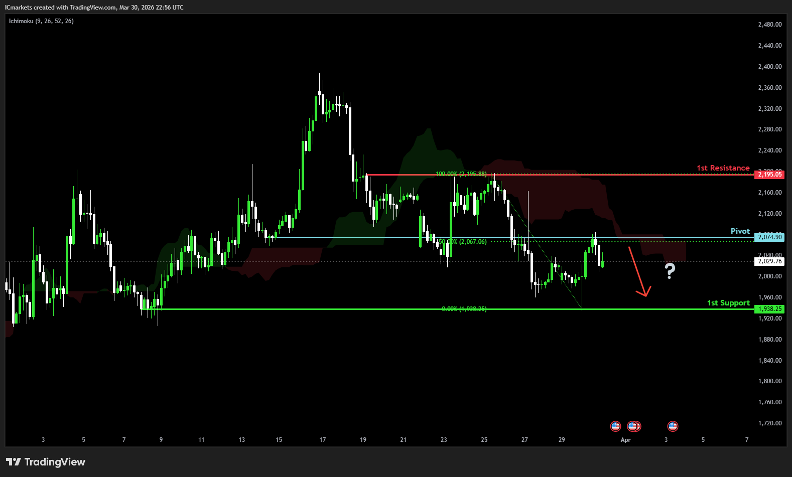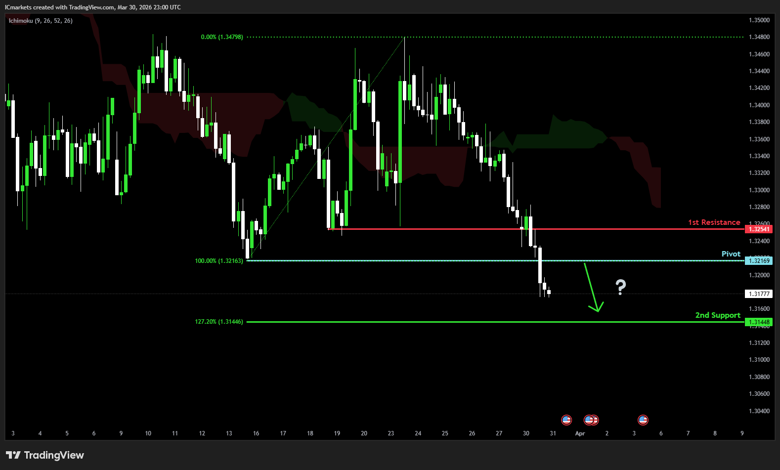 The price could see a short-term pullback toward the pivot before continuing its bearish move down toward the 1st support.