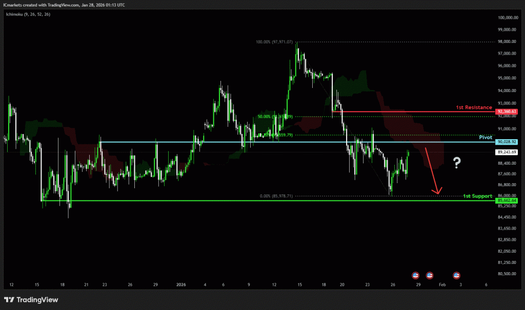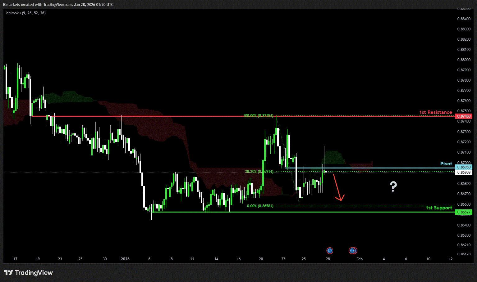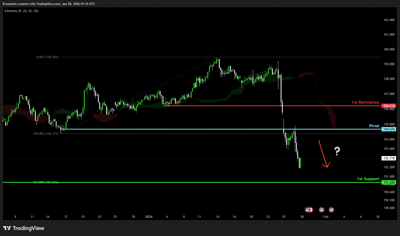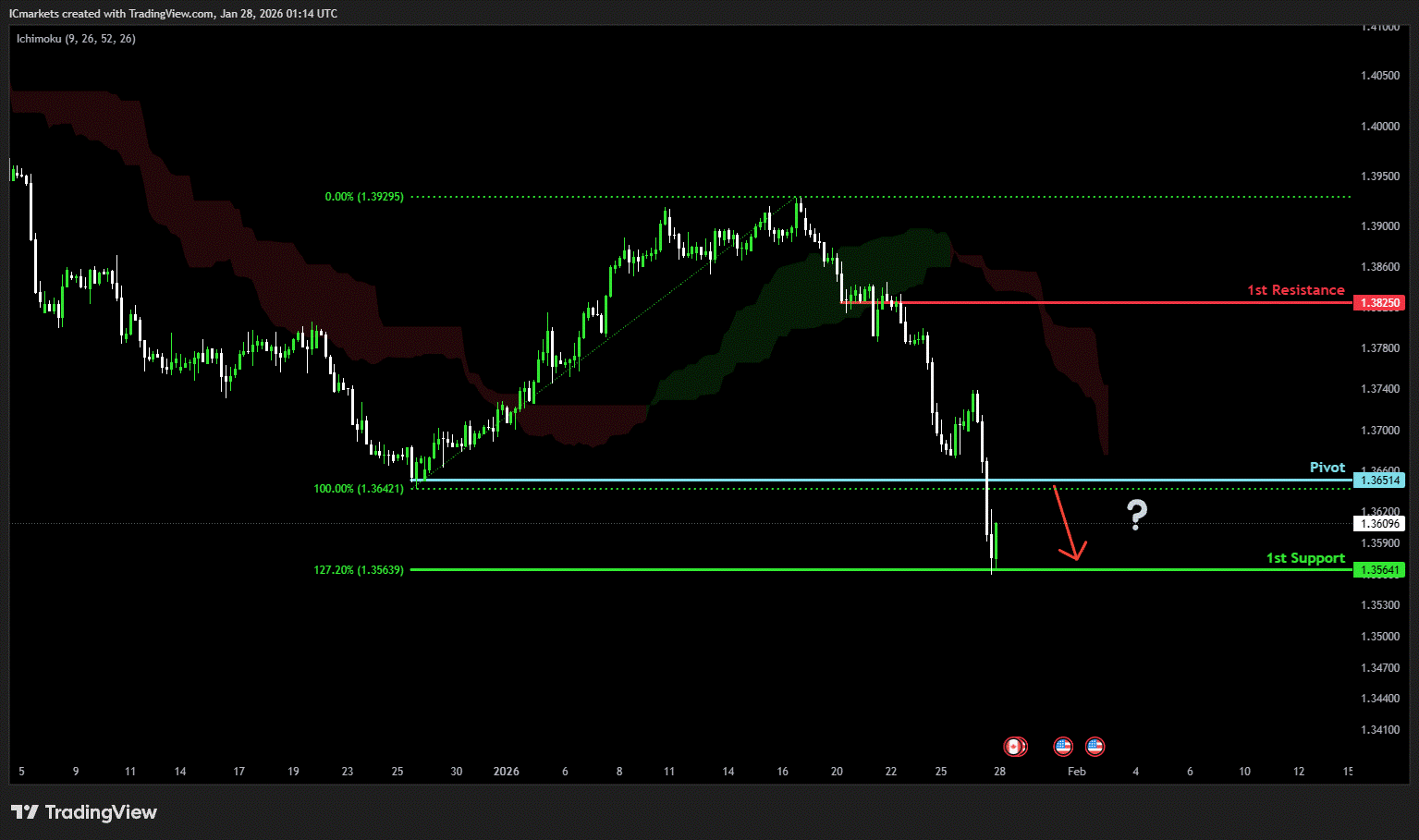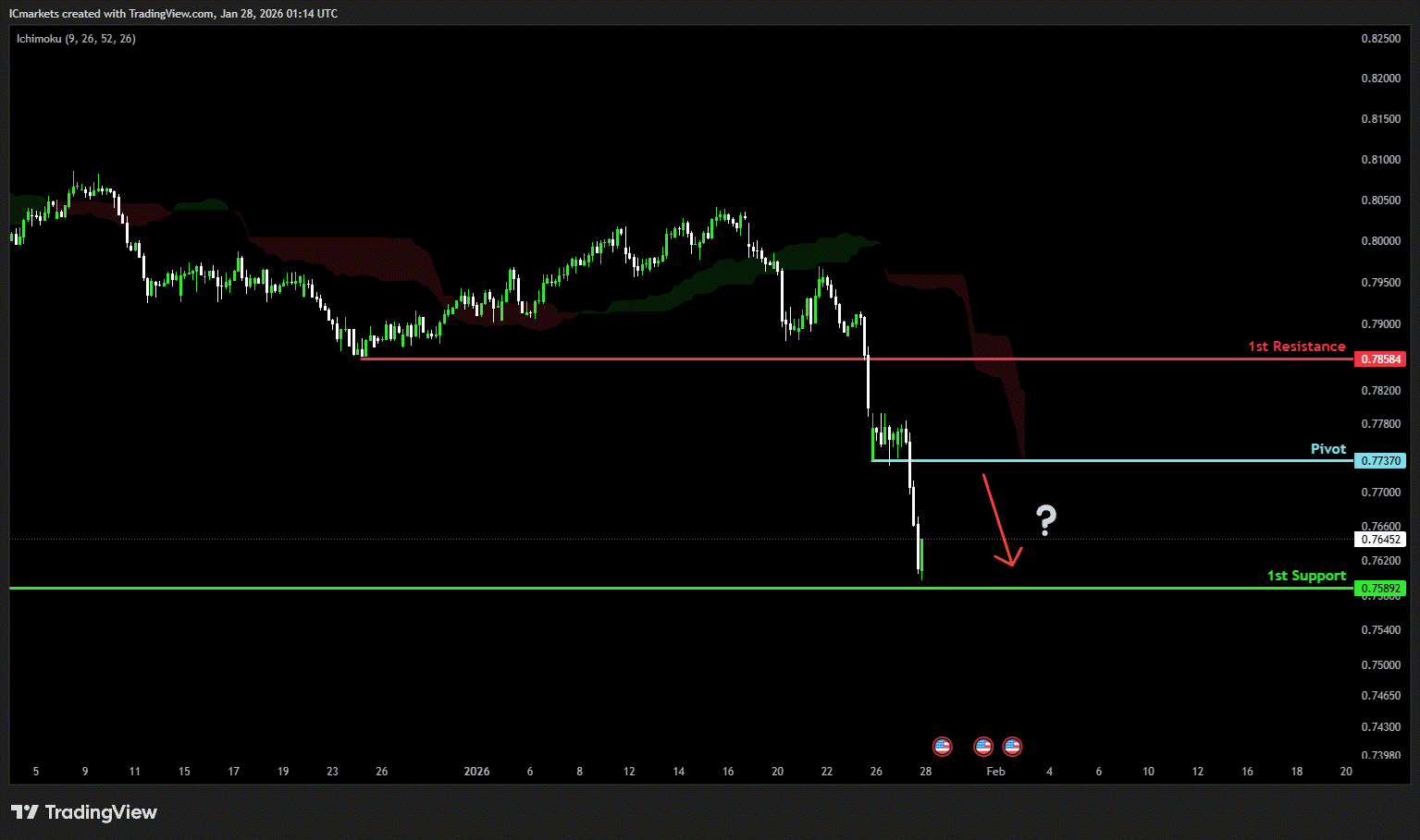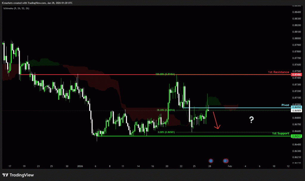 The price could see a short-term pullback toward the pivot before continuing its bearish move down toward the 1st support.