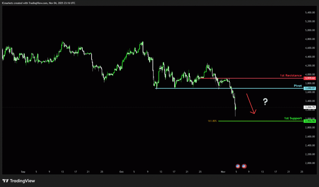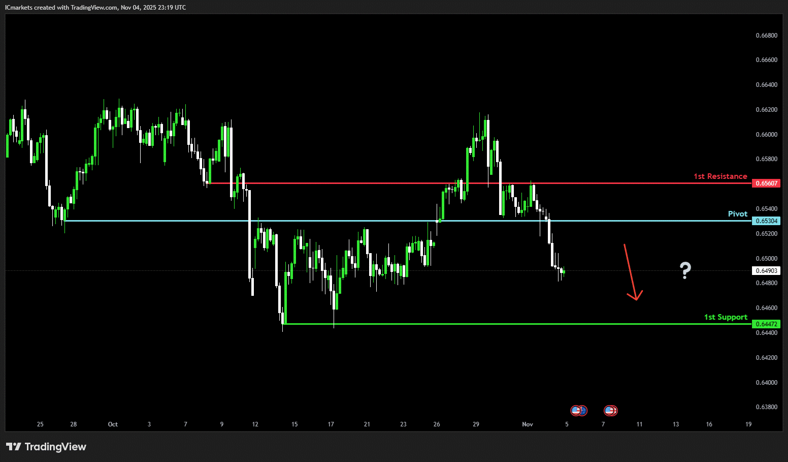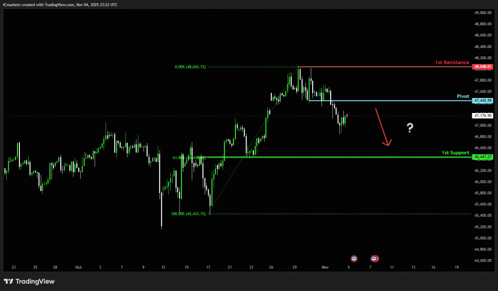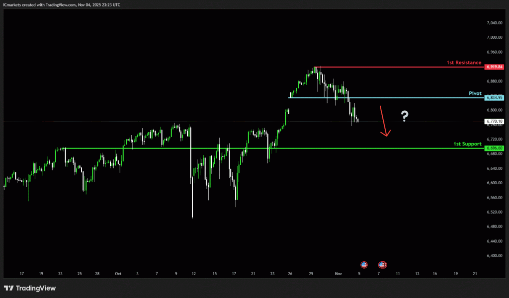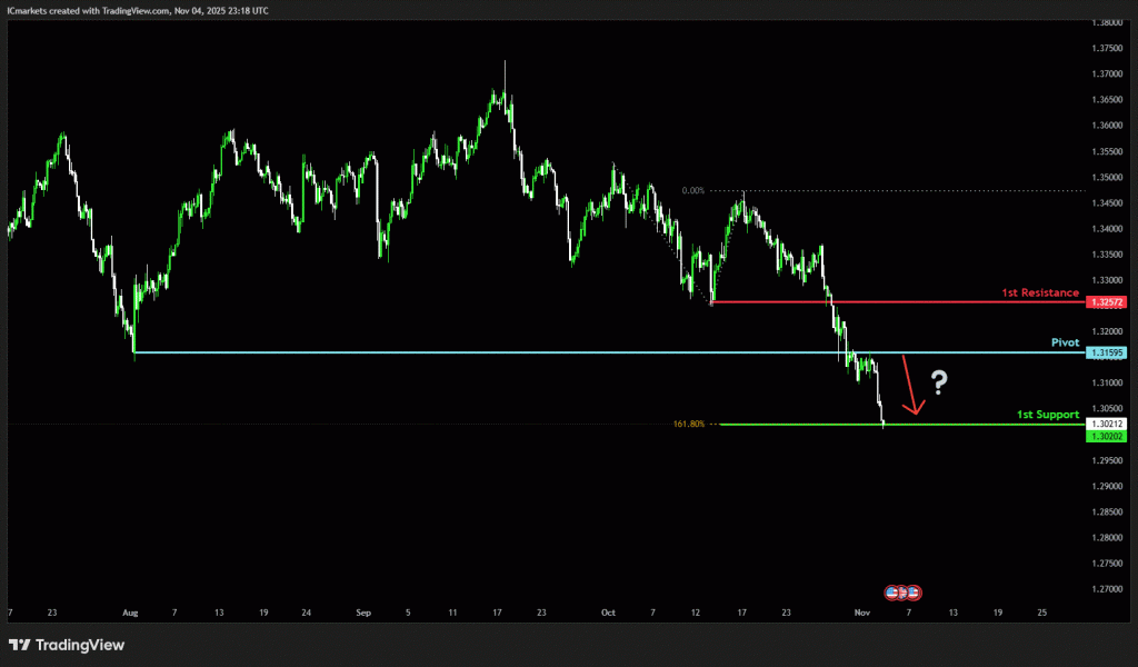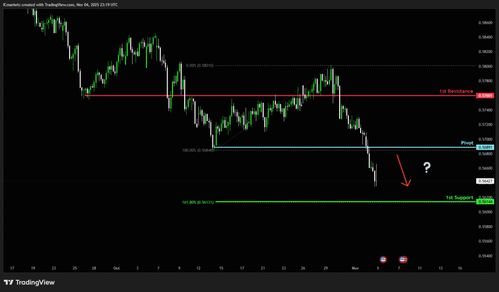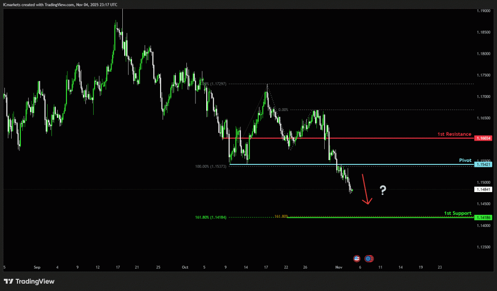 The price could see a short-term pullback toward the pivot before continuing its bearish move down toward the 1st support.