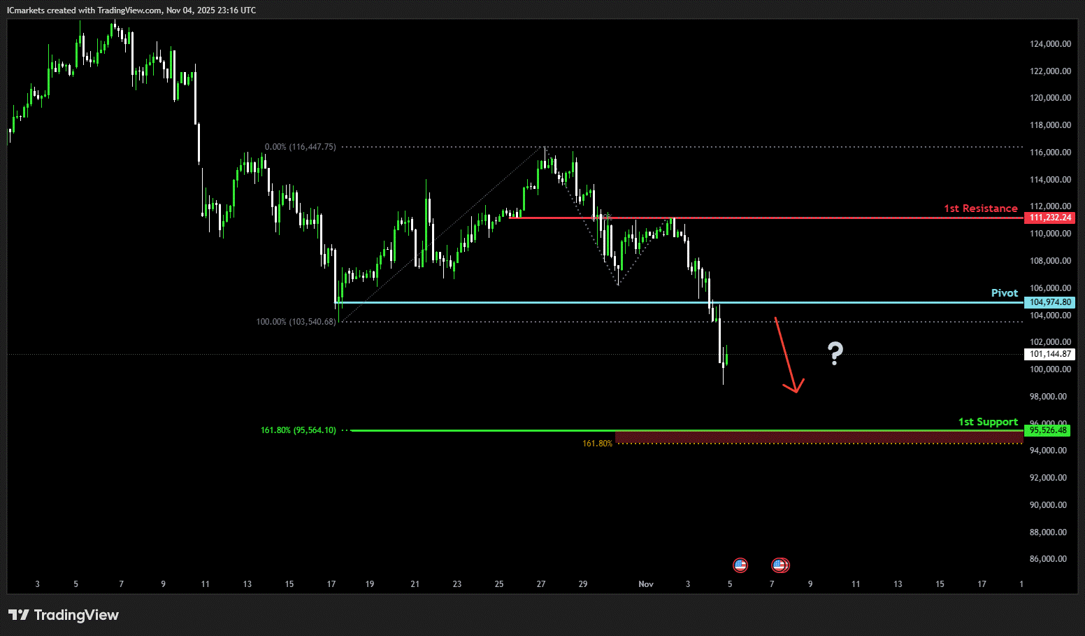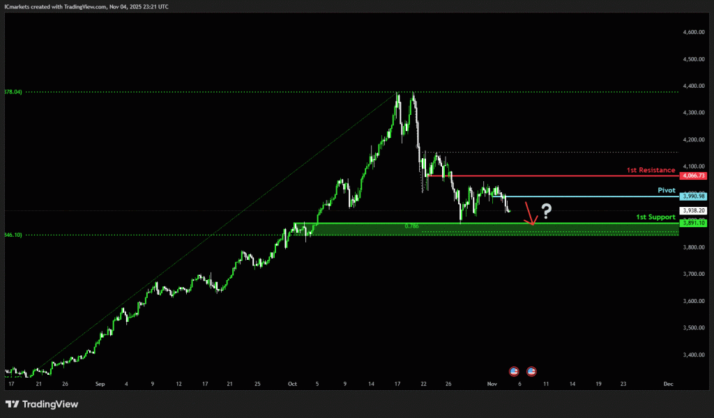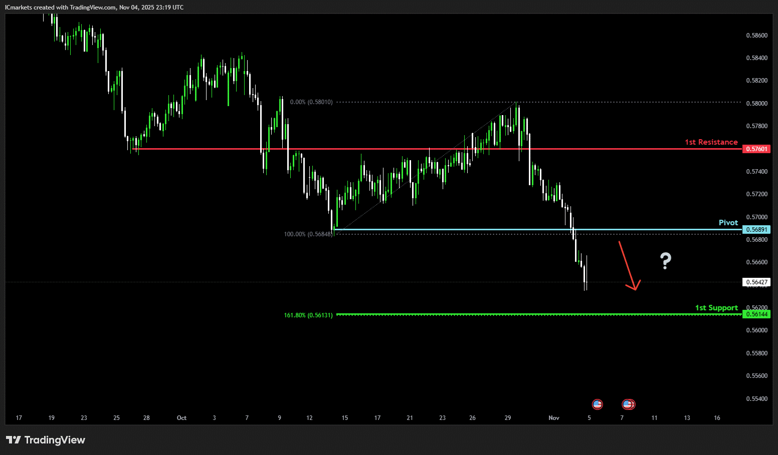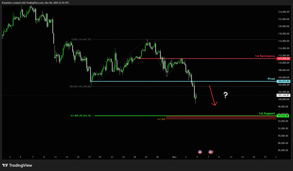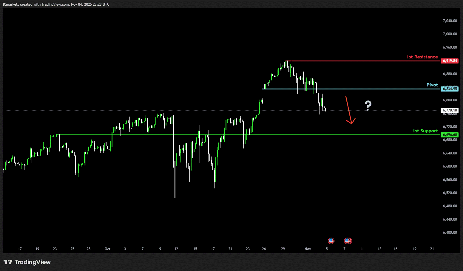 The price could see a short-term pullback toward the pivot before continuing its bearish move down toward the 1st support.